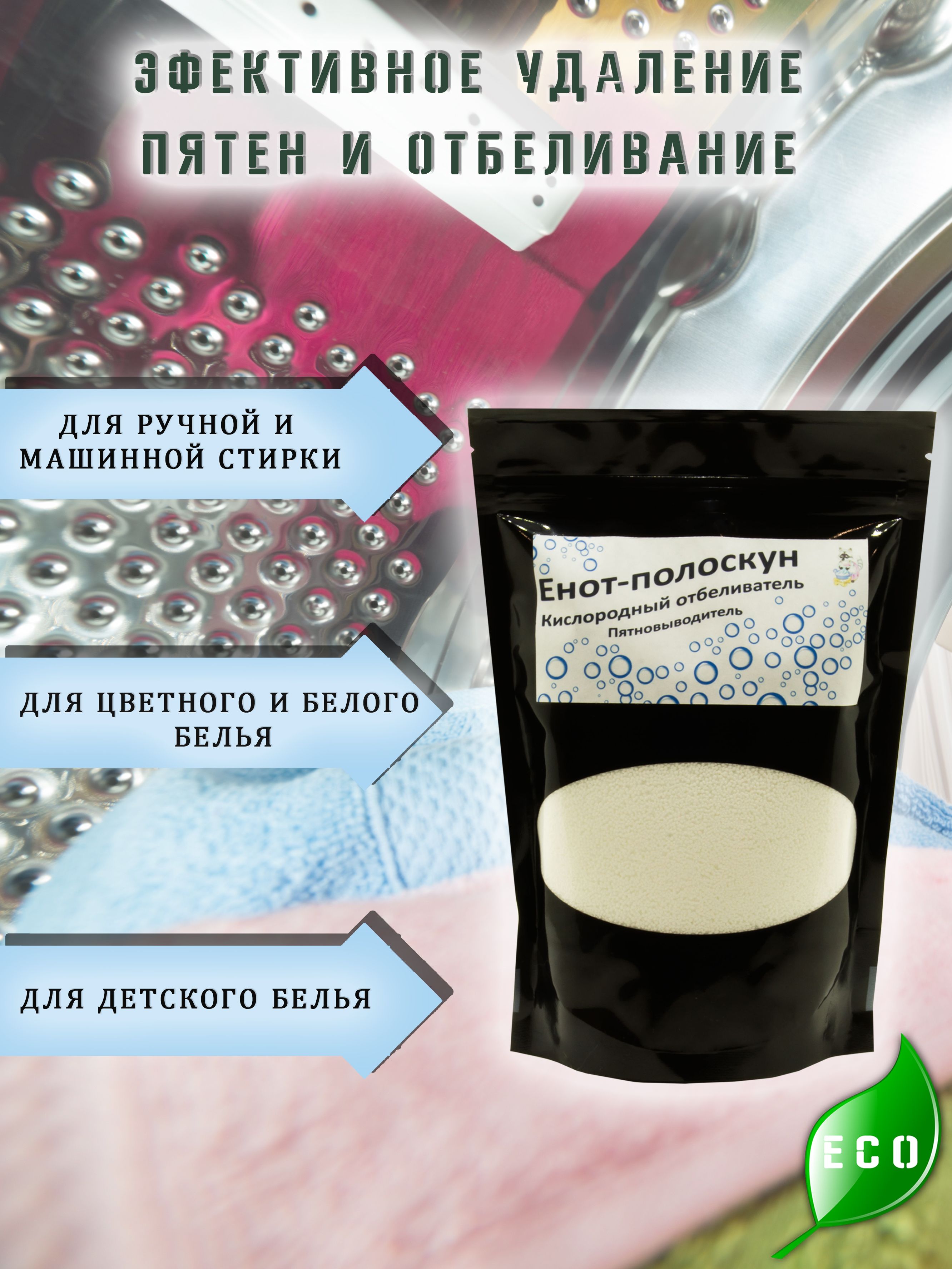 Описание: Кислородный отбеливатель эффективно удаляет даже самые тяжёлые пятна и отбеливает бельё. Отбеливатель для стирки цветных и белых вещей положительно влияет на цвет ткани. Даже после огромного количества стирок вещи не теряют цвет. Экологичный пятновыводитель, при контакте с водой распадается на абсолютно безвредные вещества. Гипоаллергенный. Используется как детский пятновыводитель для стирки. Не содержит хлор. Без запаха. Плюс такого отбеливателя заключается в полном выполаскивании. Также данный эко порошок применяют для дезинфекции различных поверхностей, устранения неприятных запахов. В отличие от хлорсодержащих, кислородный отбеливатель безопасен для здоровья, является экологически чистым, не портит ткани при стирке или замачивании. Кислородный отбеливатель не оказывают разрушительного действия на детали стиральных машин.