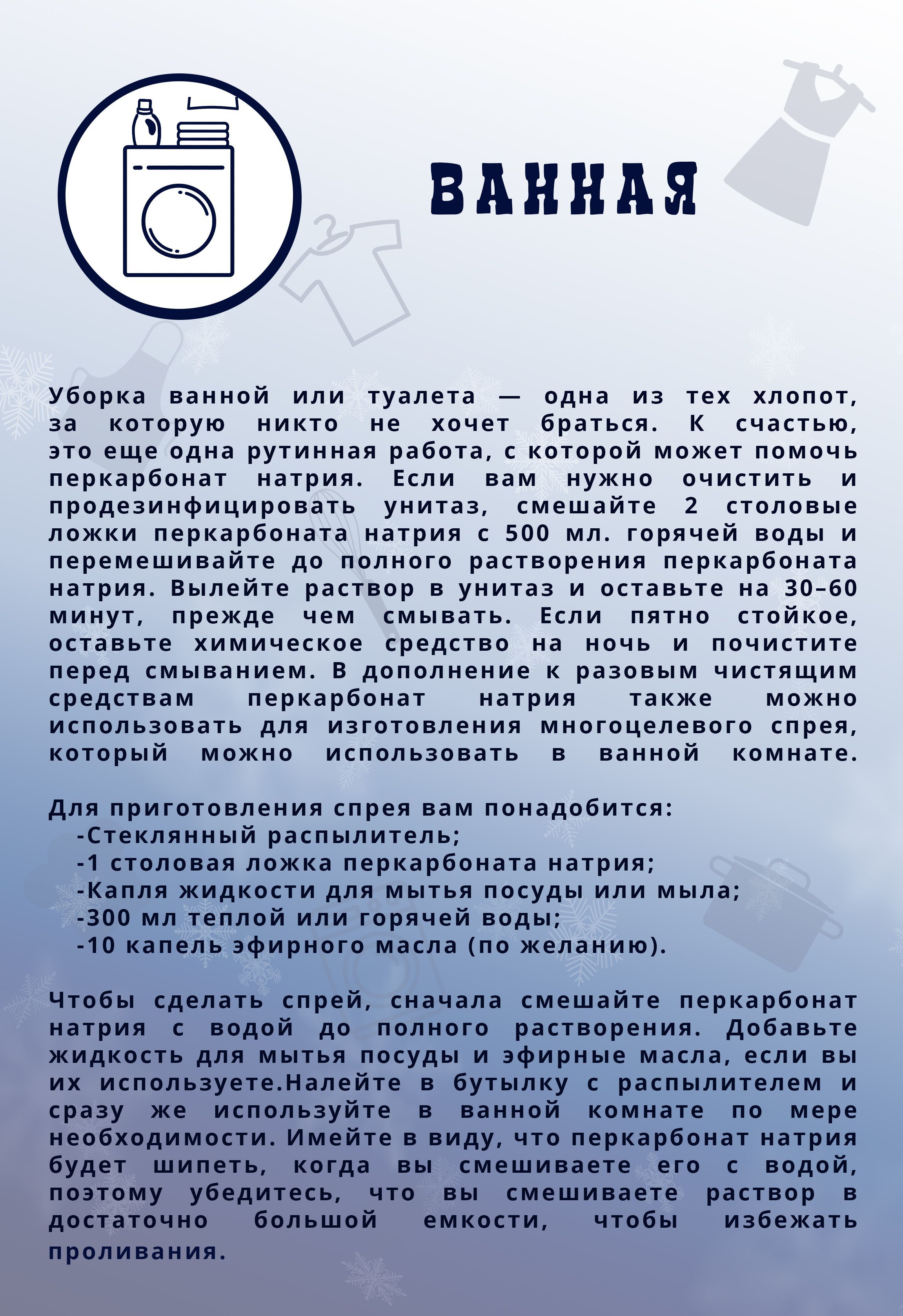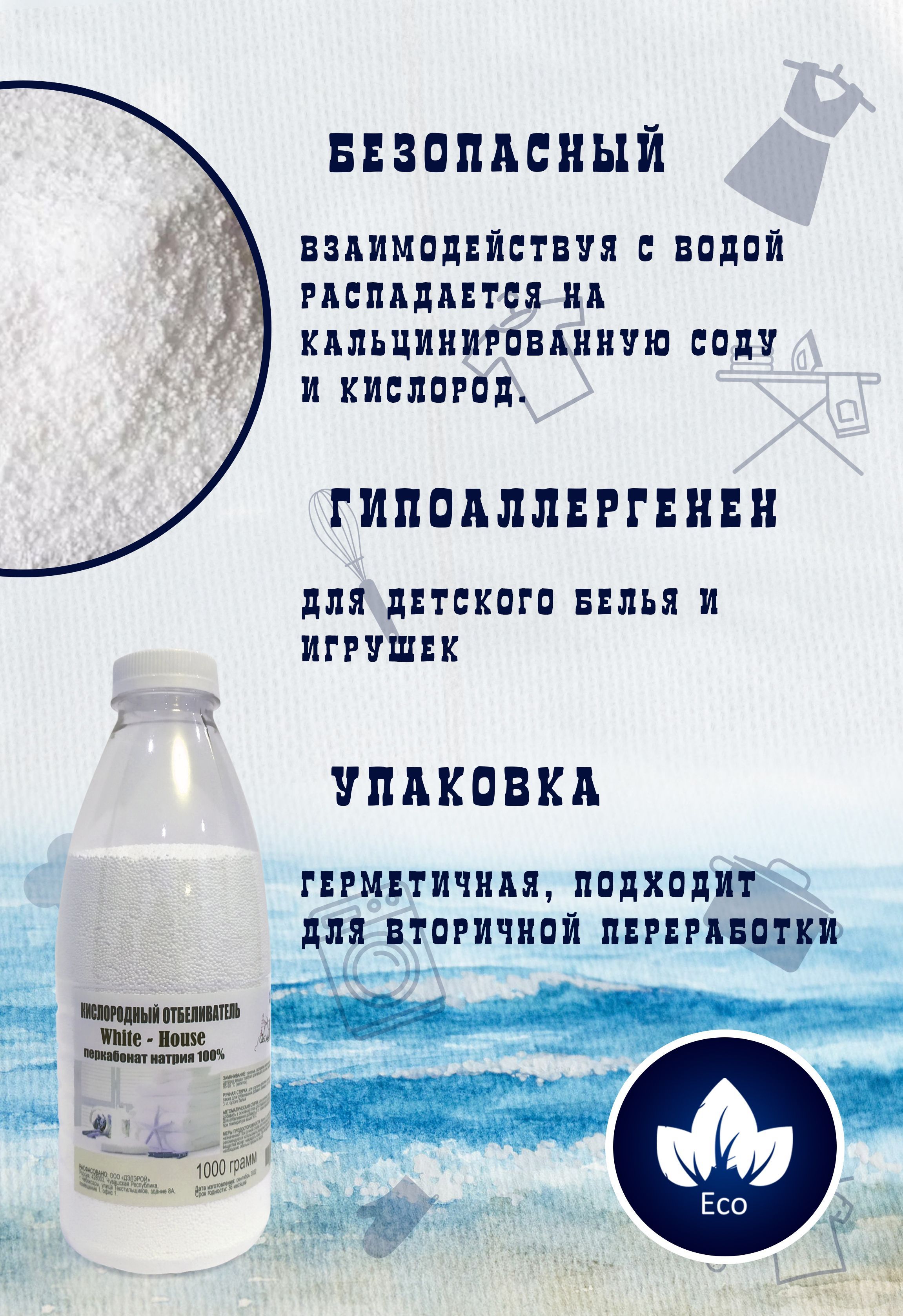Описание: Кислородный отбеливатель, пятновыводитель White-Housе. Эко-отбеливатель, с активным кислородом. Безопасное, гипоаллергенное средство, для стирки уборки в доме. Распадется на кислород, соду и воду. Подходит для стирки белья и выведения пятен на белых и цветных тканях. Также подходит для замачивания и стирки детских вещей, с рождения. Экологичный пятновыводитель, подходит для посудомоечных машин (понадобится всего лишь столовая ложка этого вещества) и замачивания посуды. Еще отбеливатель очень легко справляется с запахами при обработке кошачьих лотков. С легкостью отмоет домашние тапочки, из любых материалов, белую подошву, кроссовки, шнурки, стельки. Этот мощный природный окислитель. способен убрать с поверхностей все типы загрязнений. Экологически чистый кислородсодержащий компонент, подходит для дезинфекции и чистки ковров, мягкой мебели, всех рабочих зон. Усиливает действие основного моющего средства, а также обладает отбеливающими и пятновыводящими свойствами. Отстирывает все безнадежные и застарелые пятна. Машинная стирка 1-2 столовые ложки перкарбоната, в зависимости от количества белья и степени загрязнения вещей, насыпаем в отсек для основной стирки вместе со стиральным порошком. Перкарбонат натрия применяют в качестве дезинфицирующего средства (1 столовая ложка на литр воды). Особенно там, где работа связана с детьми или риском развития аллергии. Поможет справиться с плесенью в доме. На места, где есть плесень, достаточно нанести раствор (3 столовые ложки на 250 мл воды и через 20 минут тщательно промыть, протерев влажной тряпкой. Для более эффективного применения, и выведения пятен, с помощью отбеливателя White House, рекомендуем замочить изделия в воде при темпереатуреот 80° до 90°, однако действовать он начинает уже при 60 градусах. Температура воды должна быть не меньше 60°С. Кроме того вещь перед стиркой в машине можно замочить с перкарбонатом и после выстирать в привычном режиме без него. Предварительное замачивание перед основной стиркой и отбеливание 1-2 столовые ложки перкарбоната в зависимости от степени загрязнения вещей, чем выше температура воды, тем лучше эффект. После этого вещи необходимо прополоскать или выстирать. Поласкать вещи после перкарбоната можно даже в ручную. Дезинфицирующее средство поверхностей в помещениях. ХРАНЕНИЕ: хранить в сухом месте, в непромокаемой таре при температуре не выше 30° C.