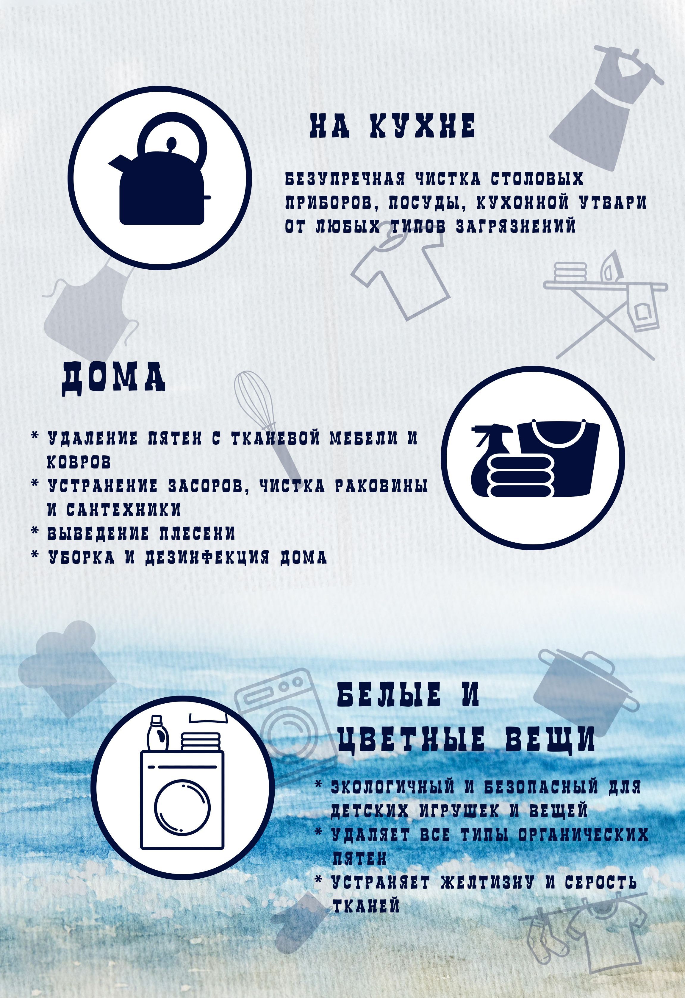 Особенности применения: Антибактериальный эффект, Гипоаллергенность, Отбеливание, Экосредство, Антистатический эффект