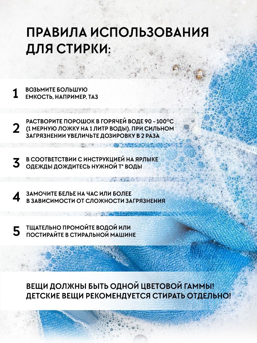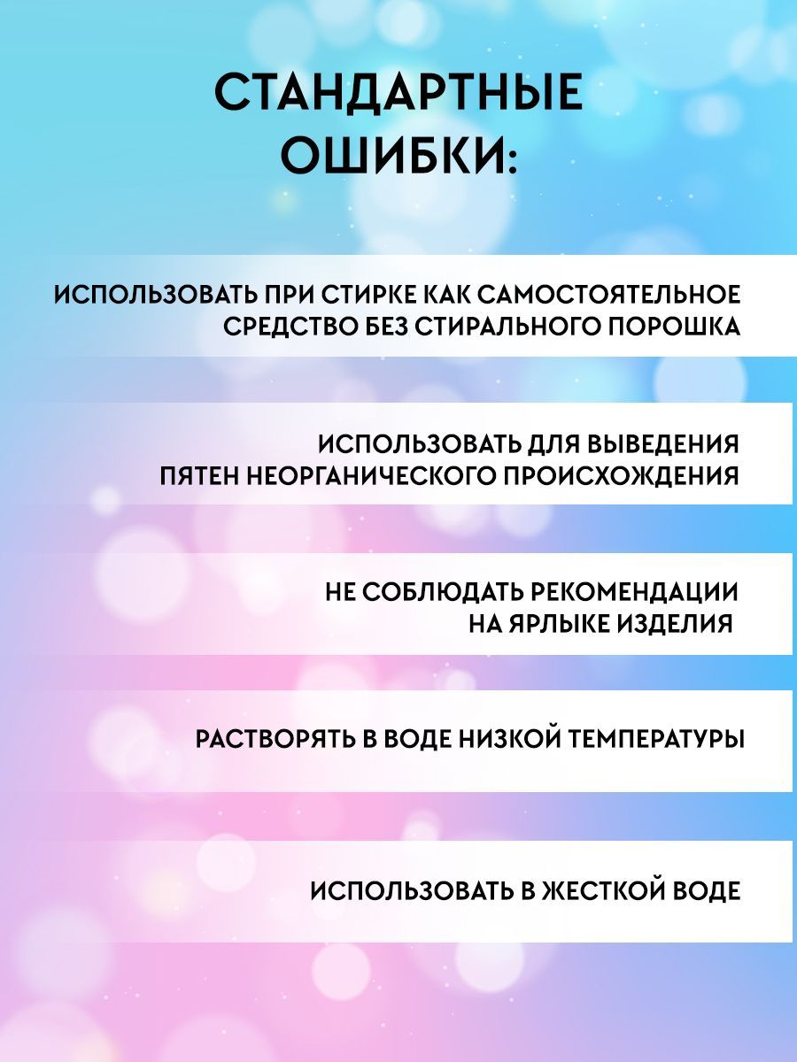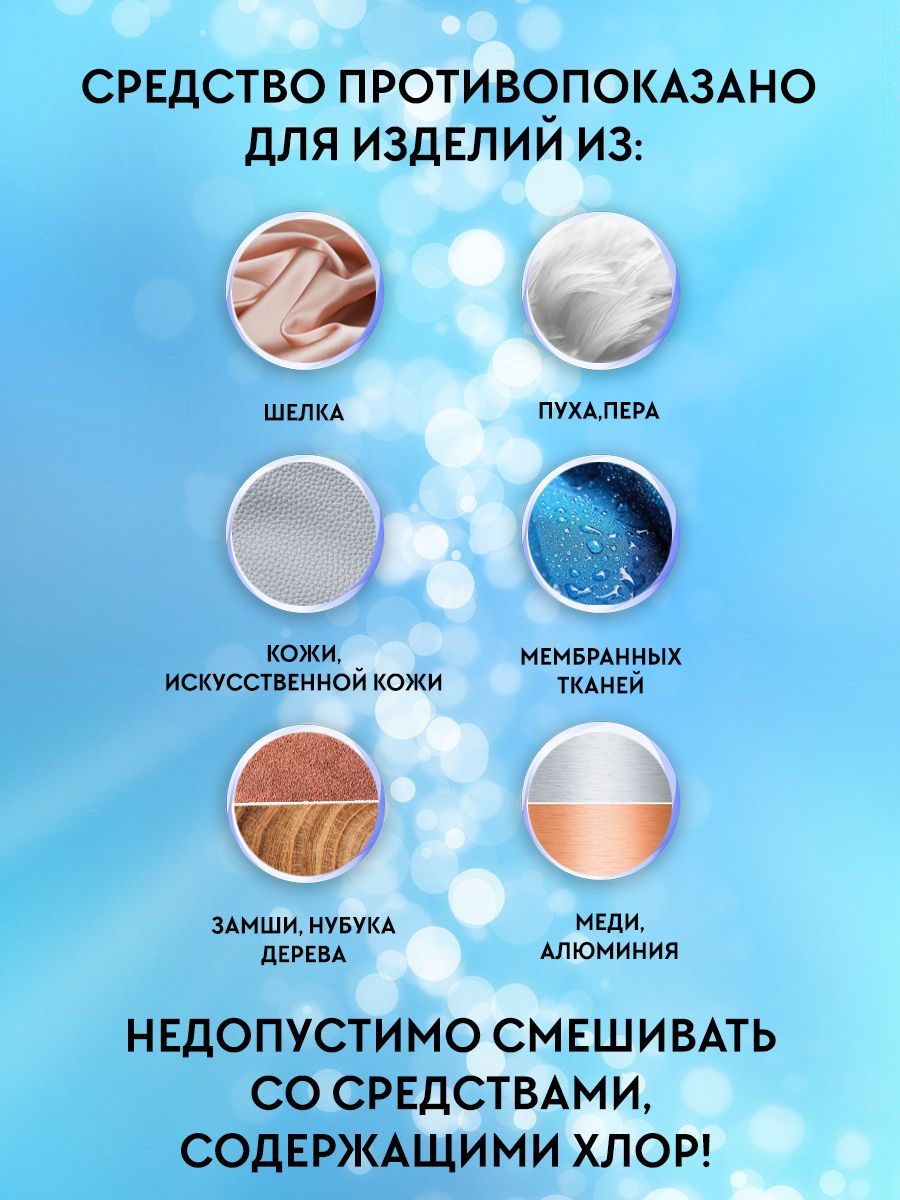 Отбеливатель кислородный НЕЛЬЗЯ использовать для стирки и очистки мембраны, шелка, замши, нубука, искусственной кожи, шерсти, пуха, пера и дерева. Также нельзя использовать для уборки и удаления грязи с металлических поверхностей, где содержится медь и алюминий. Категорически нельзя смешивать отбеливатель со средствами, содержащими хлор!