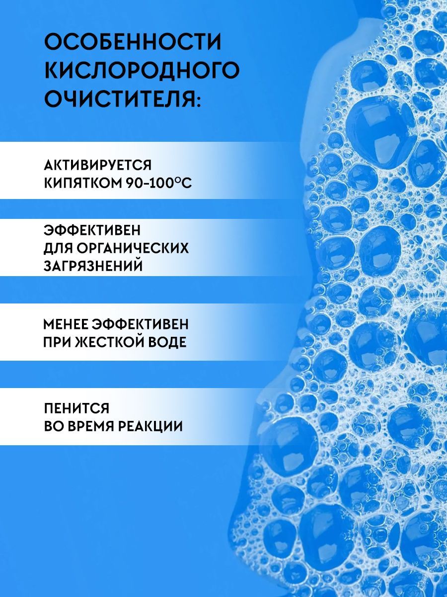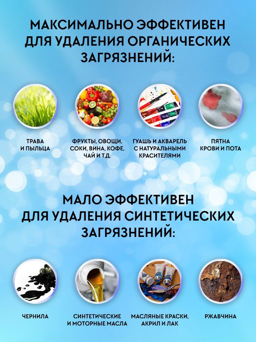Благодаря своему мощному окислительному действию пятновыводитель кислородный способен эффективно удалять все виды органических загрязнений с различных поверхностей.