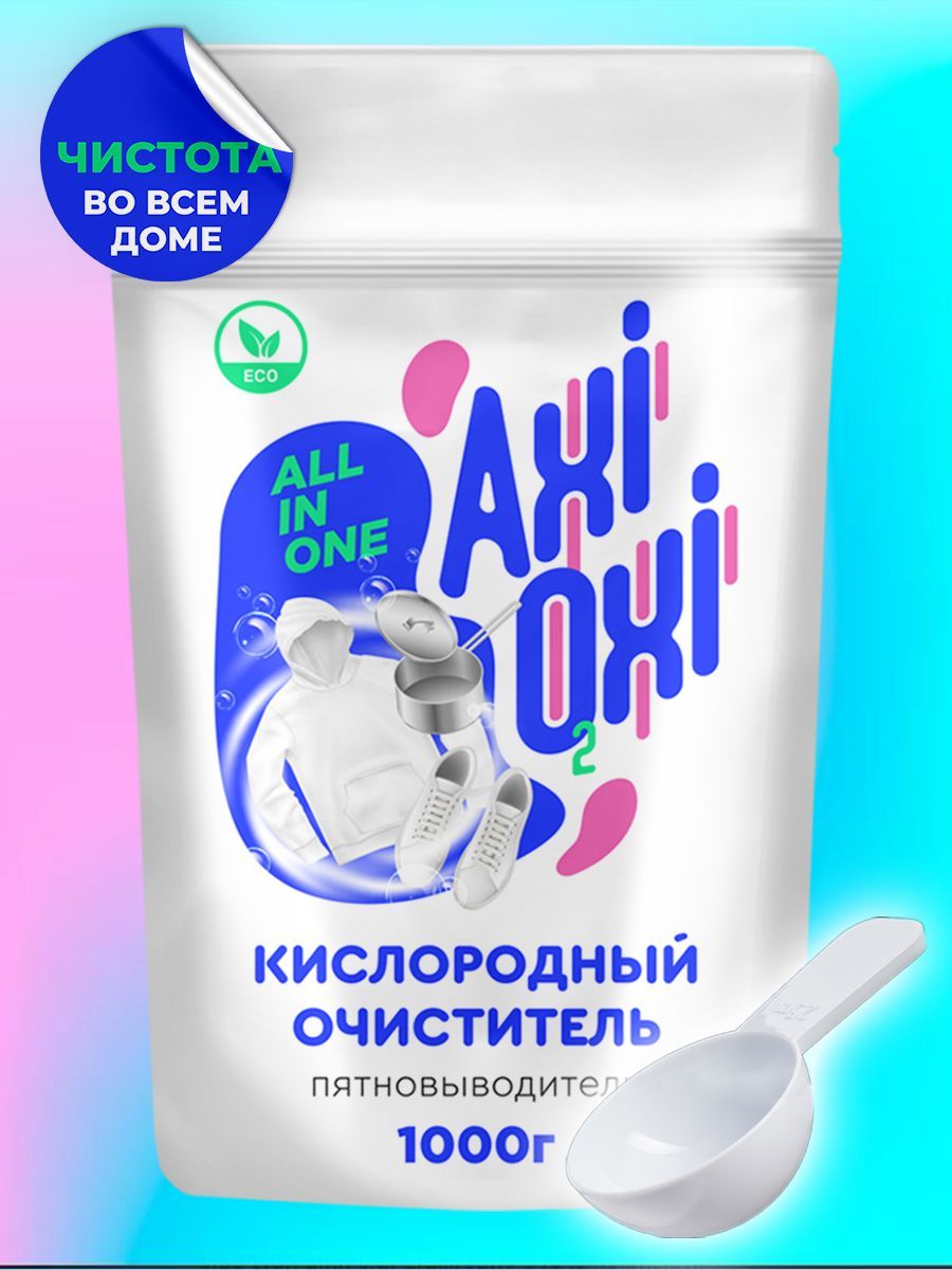 Описание: Возможности кислородного очистителя AxiOxi настолько широки, что он заменит вам более 20 различных средств для удаления пятен и чистки. Его можно использовать как пятновыводитель, как усилитель порошка для стирки, отбеливатель, антиналет, средство для чистки обуви, для текстиля (для ковров, мебели), для дезинфекции, для сантехники и для удаления загрязнений с различных поверхностей. Вам не придется тратить деньги на дорогие средства для удаления пятен, достаточно взять наш AxiOxi.