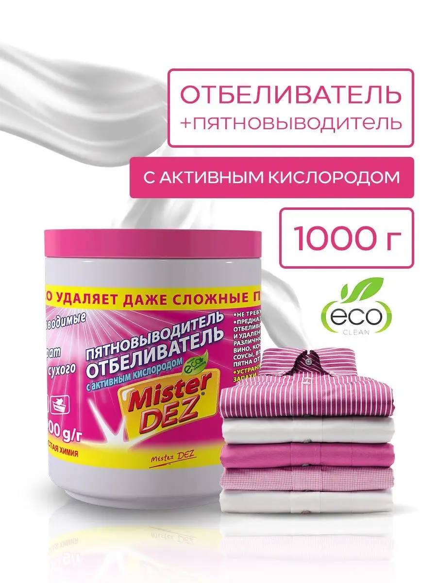 Описание: Пятна на одежде могут легко испортить Вам настроение. Кислородный отбеливатель – пятновыводитель для белья Mister Dez Eco-Cleaning – это быстрое и простое решение проблемы. Средство специально разработано для эффективного удаления различных пятен и стойких загрязнений, а также для безупречного отбеливания тусклых и пожелтевших вещей. Универсальное средство не содержит хлора и безопасно для ваших вещей и здоровья. Активный кислород в составе осветляет белую одежду и постельное белье, удаляет пятна с белых и цветных тканей, не повреждает волокна, сохраняет красивый цвет ваших вещей. Комплекс энзимов эффективно удаляет загрязнения белкового происхождения. Уникальная формула позволяет справиться с широким спектром пятен: вино, кофе, кровь, жирные соусы, въевшаяся грязь, следы от травы, ягод. Кислородный отбеливатель – пятновыводитель для белья Mister Dez Eco-Cleaning подходит для любых белых, цветных, деликатных тканей, а также для детского белья. Эффективен уже при +40 °C. Устраняет неприятные запахи, обладает дезинфицирующими свойствами. Большая экономичная упаковка. Для ручной и машинной стирки. Не вызывает коррозию внутренних элементов стиральных машин. Гранулированная форма не пылит и не раздражает слизистую носа при вдыхании. Товар сертифицирован. Входит в линейку Eco Cleaning - не содержит вредные и опасные для окружающей среды химические вещества. Поставка от производителя. Состав: 30% и более содосульфатная смесь; 15% и более, но менее 30% перкарбонат натрия; менее 5%: триполифосфат натрия, хлорид натрия, А-ПАВ, энзимы, ТАЕД-усилитель стирального порошка, оптический отбеливатель.