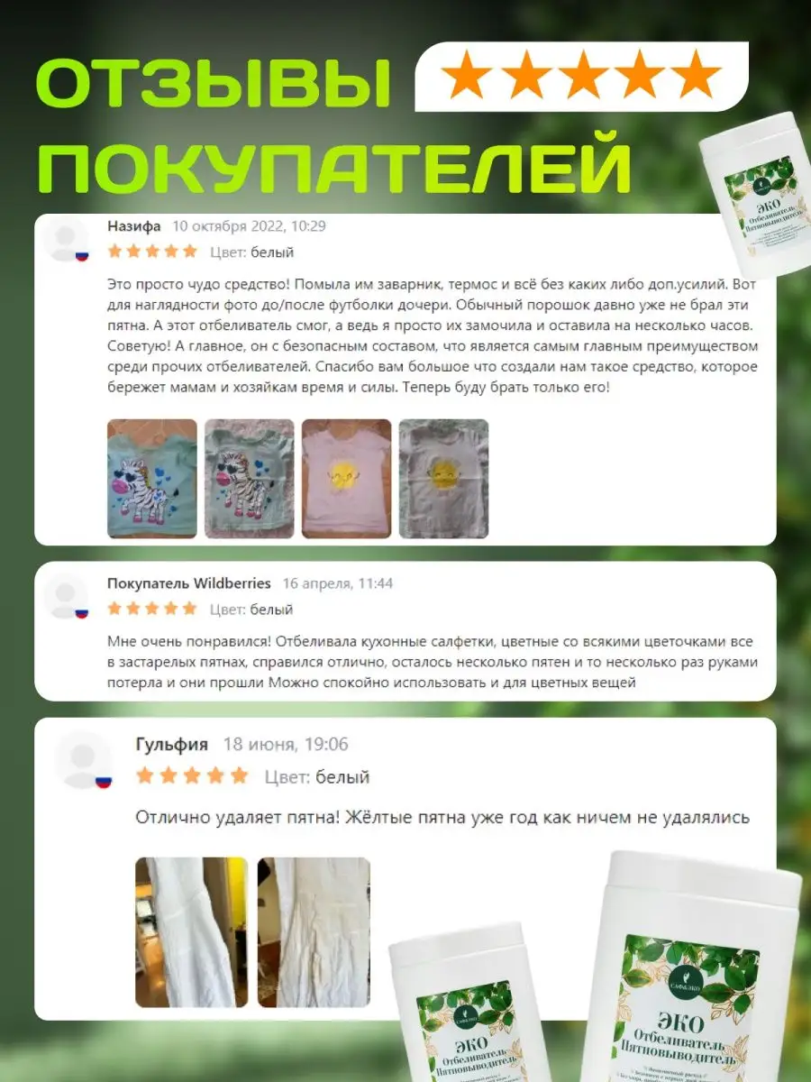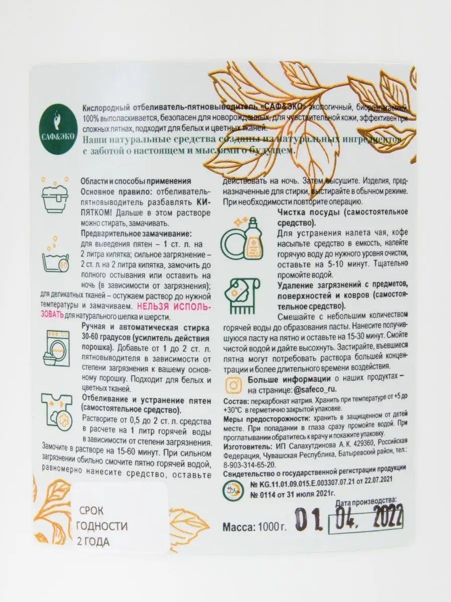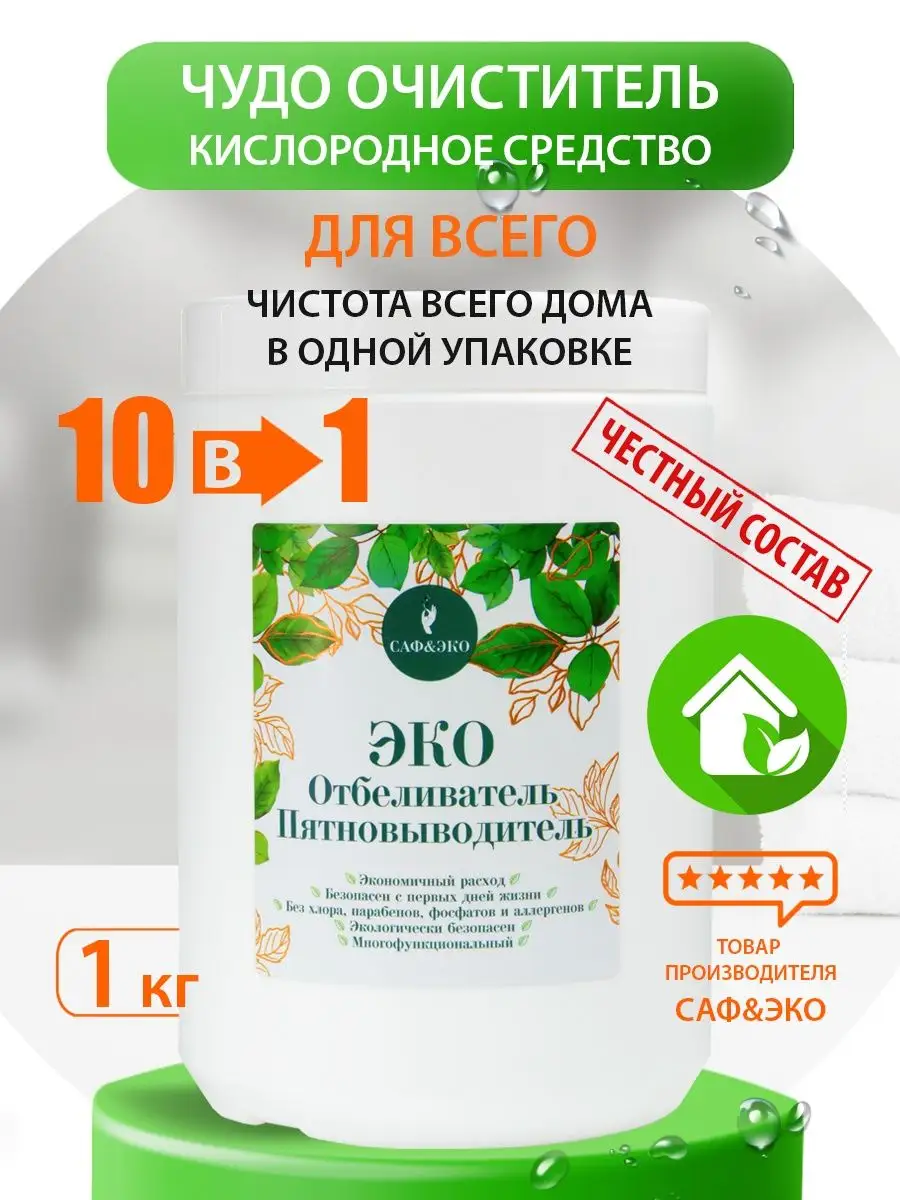 Описание: Инновационный стиральный порошок пятновыводитель. Активная щадящая формула отбеливателя направлена на удаление сложных и трудновыводимых пятен, таких как пота, жира, кофе, крови не повреждая структуру ткани и любой поверхности. Средство антипятнин многофункциональное и подходит не только для стирки, но и для чистки различных поверхностей дома. Eco очиститель с легкостью справится на кухне с нагаром и гарью на посуде. Кухонной утвари и в духовке. Мойкой ковров и мягкой мебели. Эффективно отмоет грязь и следы жизнедеятельности человека с пластика и сантехники в туалете и ванной. Без особых усилий отстирает въевшиеся загрязнения на белом или цветном белье, при этом цвет останется прежним. Это чудо средство по праву можно назвать эффективным отбеливателем, абсолютно безвредным для окружающей среды. Человека и животных. В составе экологический 100% перкарбонат натрия, он полностью выполаскивается из материала, не оставляя следов и разводов после себя. Эко пятновыводитель без хлора, не содержит парабенов. Фосфатов и аллергенов. Поэтому он гиппоаллергенный и подходит для стирки вещей для новорожденных, людей с чувствительной кожей. Детской одежды. Универсальный концентратор рекомендуется использовать для мытья детских игрушек, очищения кроссовок. Белой подошвы и любой другой обуви. Допускается использование как в стиральной машине автомат, как усилитель действия порошка, так и для ручного отстирывания. Способы применения: обязательно разбавлять кипятком! Далее в этом растворе можно замачивать и стирать. Предварительное замачивание - для выведения пятен 1 ст.л. на 2 литра кипятка, при сильных загрязнениях 2 ст.л. на 2 литра кипятка, замочить до полного остывания или оставить на ночь. Для деликатных тканей остужаем раствор до нужной температуры и замачиваем. Такой порошок многофункциональный, поэтому его можно использовать его для уборки всего дома. Такая бытовая химия незаменима среди хозяйственных товаров для дома. Внимание!!! Не используйте для шерсти, шелка!