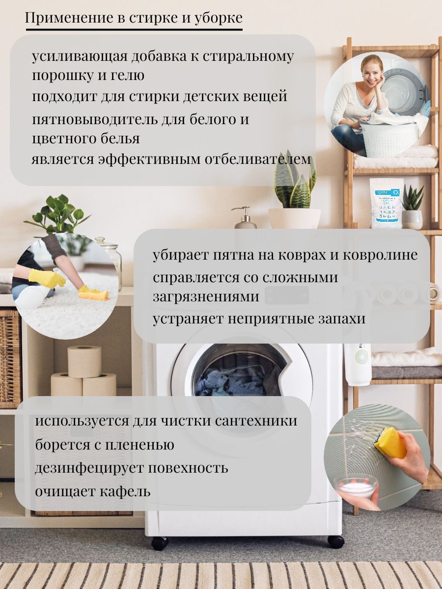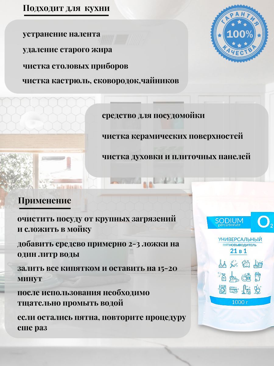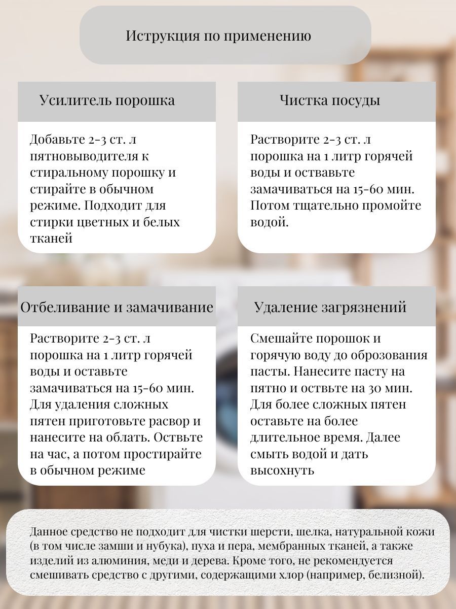 Описание: Кислородный пятновыводитель – это мощное средство, основанное на сильнодействующем кислороде, которое не только эффективно удаляет застарелые загрязнения и пятна, но и отбеливает белье, нейтрализует запахи и подходит как для белого, так и для цветного белья. Этот универсальный пятновыводитель – настоящее спасение для каждой хозяйки, так как заменяет множество средств для уборки: пятновыводитель для одежды, отбеливатель, чистящее средство, средство для удаления жира, чистящее средство для ванны, средство для чистки ковров и многое другое. Приятный бонус – кислородный пятновыводитель является экологическим средством, что позволяет использовать его как добавку к стиральному порошку без вреда для дальнейшего ношения. Выбирайте кислородный пятновыводитель и наслаждайтесь идеальной чистотой в вашем доме! Кислородный очиститель - универсальный помощник в быту. Он не только эффективно удаляет застывшие загрязнения на сковородках и чайные налеты, но и может быть использован как средство для мытья посуды и столовых приборов. Кроме того, он поможет избавиться от нагара на поверхностях. Пятновыводитель кислородный - необходимый инструмент в стирке. Он отлично подходит для стирки детских вещей, цветной и черной ткани, и эффективно справляется с различными типами загрязнений - от жирных пятен до пятен крови, вина или пота. Кислородный отбеливатель - незаменимый помощник при уборке в ванной комнате. Он эффективно удаляет заплесневелые участки, оттерает сложные загрязнения с кафеля и даже справится с засорами в трубах. Не стоит забывать, что кислородный отбеливатель - безопасный и экологичный продукт, не содержащий хлора. Кислородный отбеливатель-пятновыводитель и очиститель - это незаменимый помощник для любой домохозяйки, позволяющий сэкономить на чистке. С его помощью вы легко и эффективно справитесь с пятнами на диване, ковре, матрасе. Однако, следует учитывать, что данное средство не подходит для чистки шерсти, шелка, натуральной кожи (в том числе замши и нубука), пуха и пера, мембранных тканей, а также изделий из алюминия, меди и дерева. Кроме того, не рекомендуется смешивать средство с другими, содержащими хлор (например, белизной).