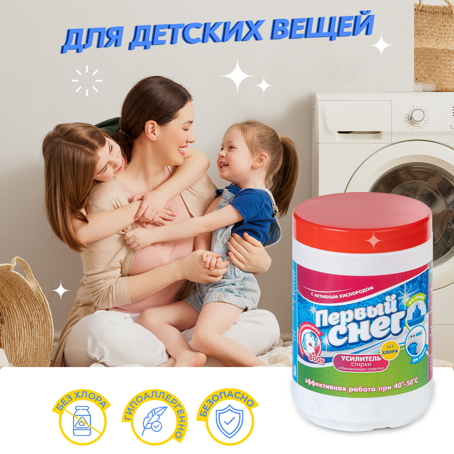 Отбеливатель пятновыводитель Первый СнегГипоаллергенный, подходит для детского бельяКислородный пятновыводитель и отбеливатель абсолютно безопасен для стирки детских вещей с самого рождения.