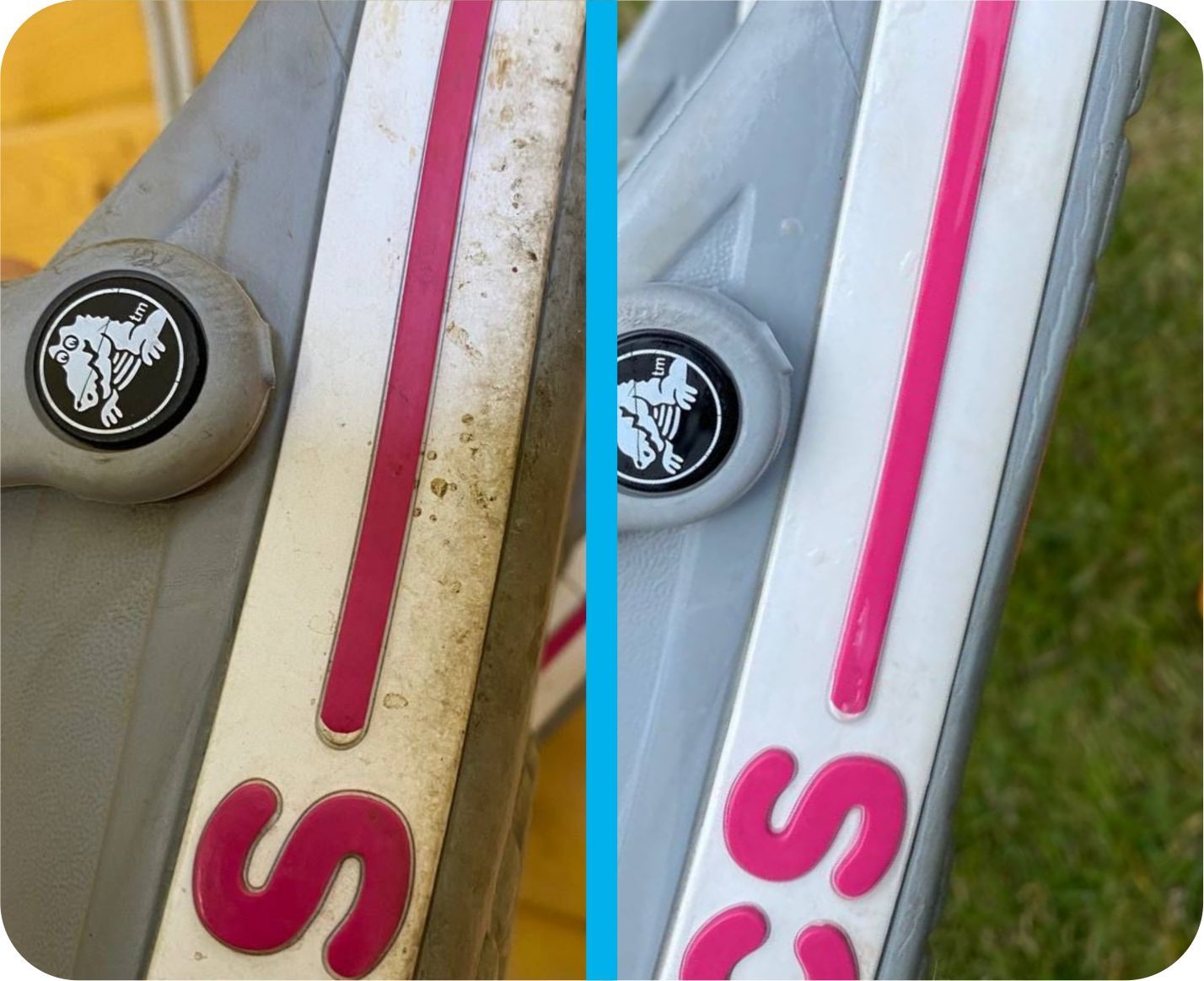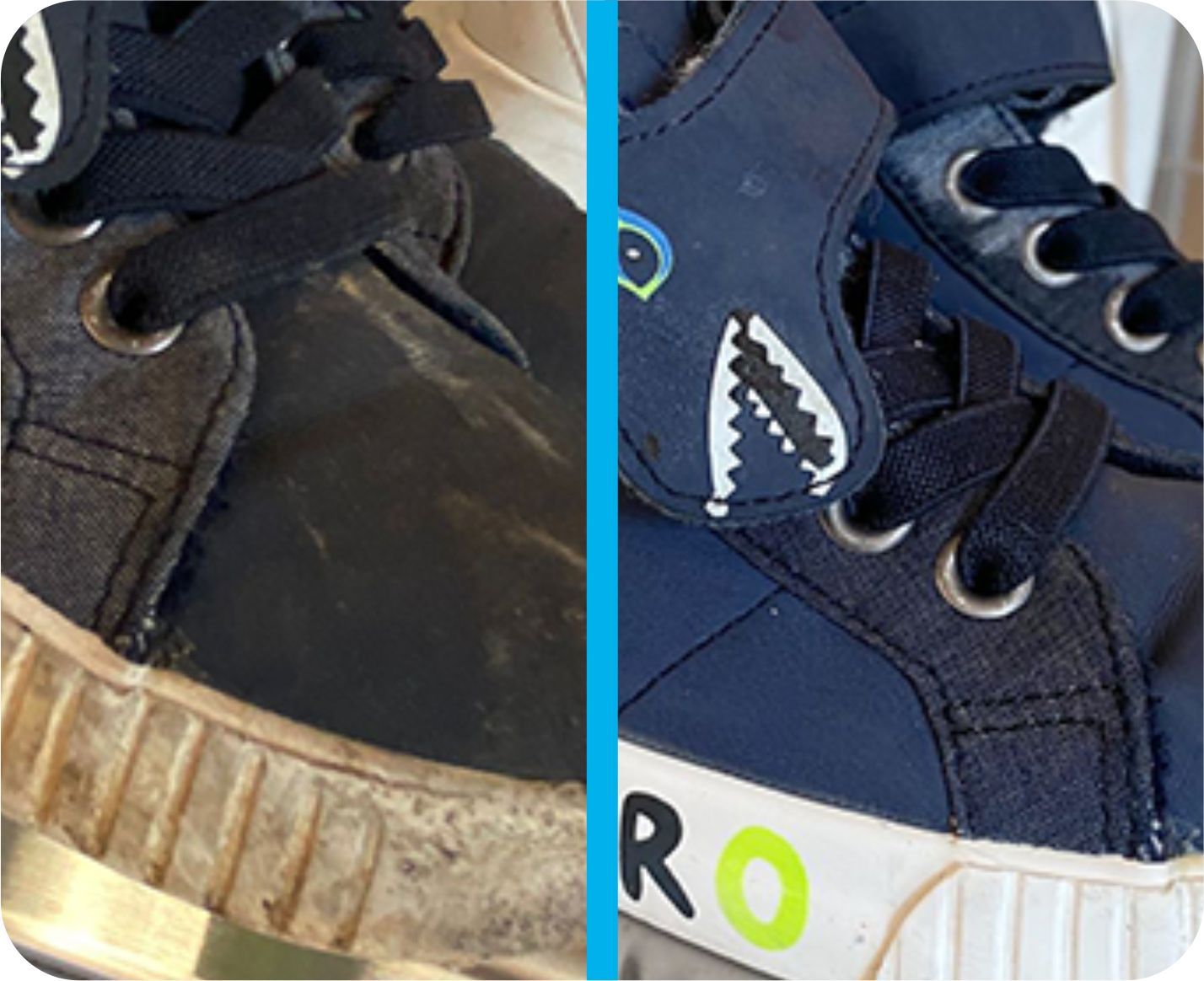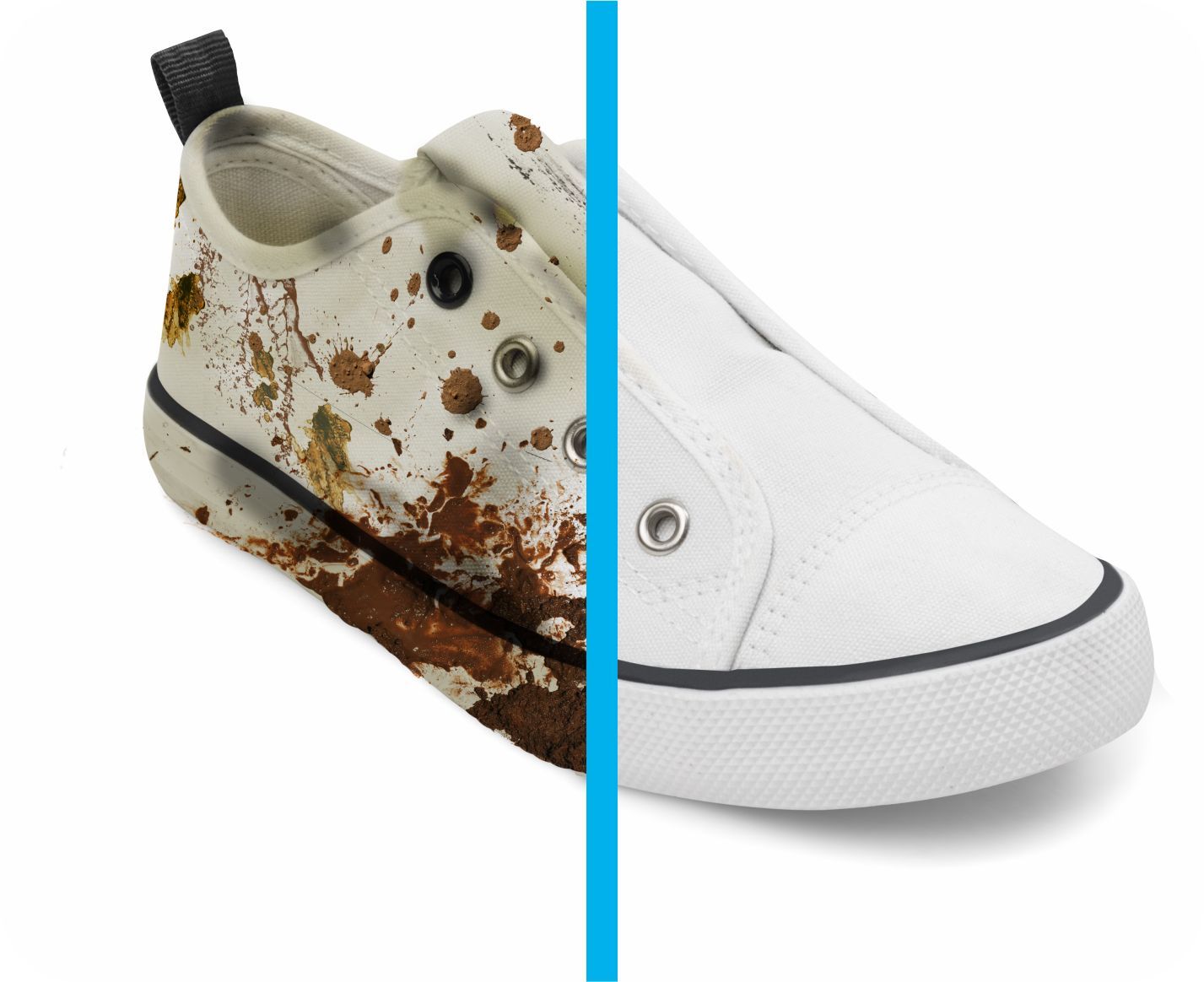 Подготовить раствор (1 мерная ложка на 1 л горячей воды), погрузить обувь и подождать от 10 минут и более. Если грязь устойчивая — можно потереть щеткой для усиления результата.Кислородный  пятновыводитель