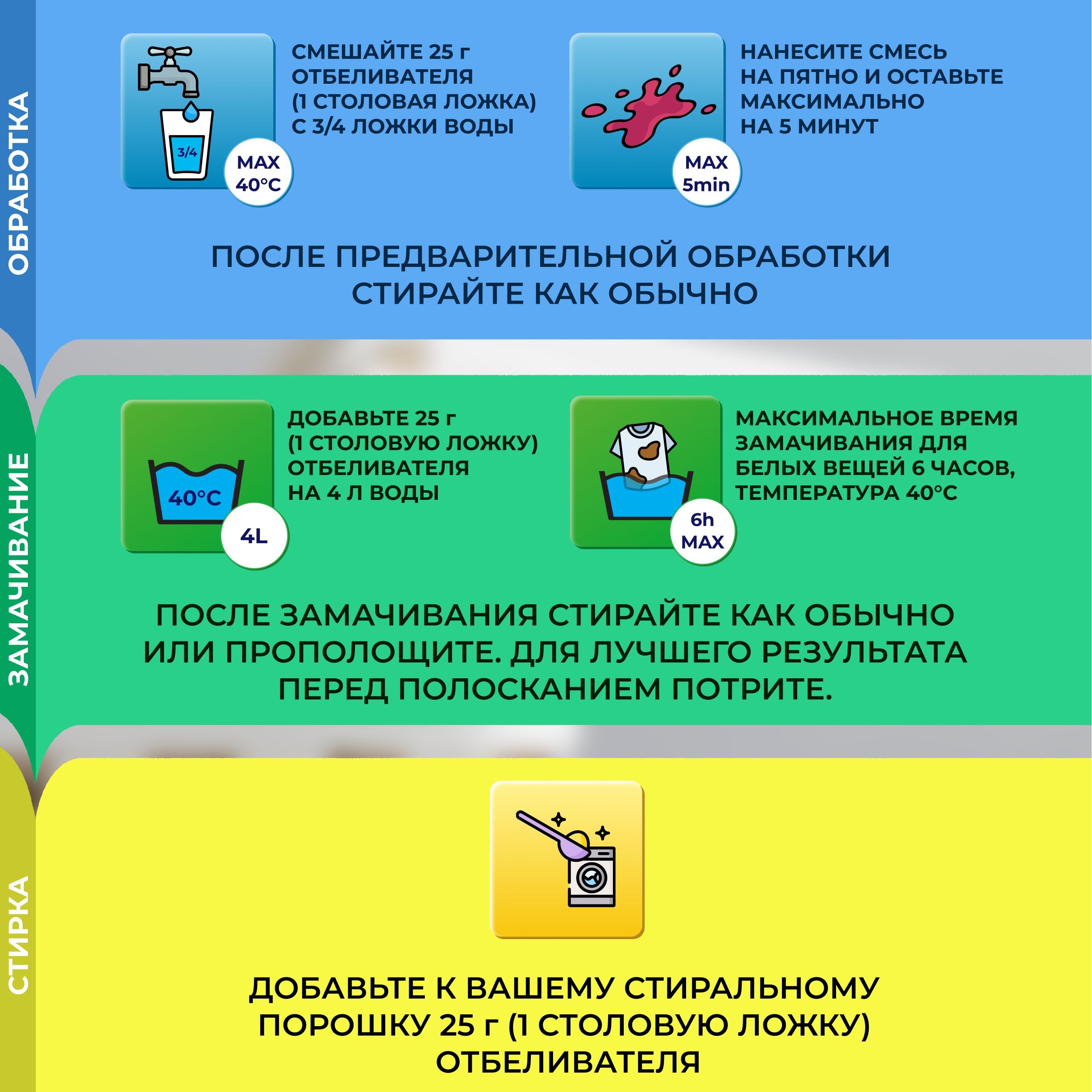 активностью отбеливателя рекомендуется надеть перчатки, чтобы защитить кожу от обезжиривания. При попадании в глаза и на кожу рук тщательно промыть водой. Не вдыхать. Хранить в сухом, недоступном для детей месте, вдали от отопительных приборов и прямых солнечных лучей при температуре не выше 35 ⁰С отдельно