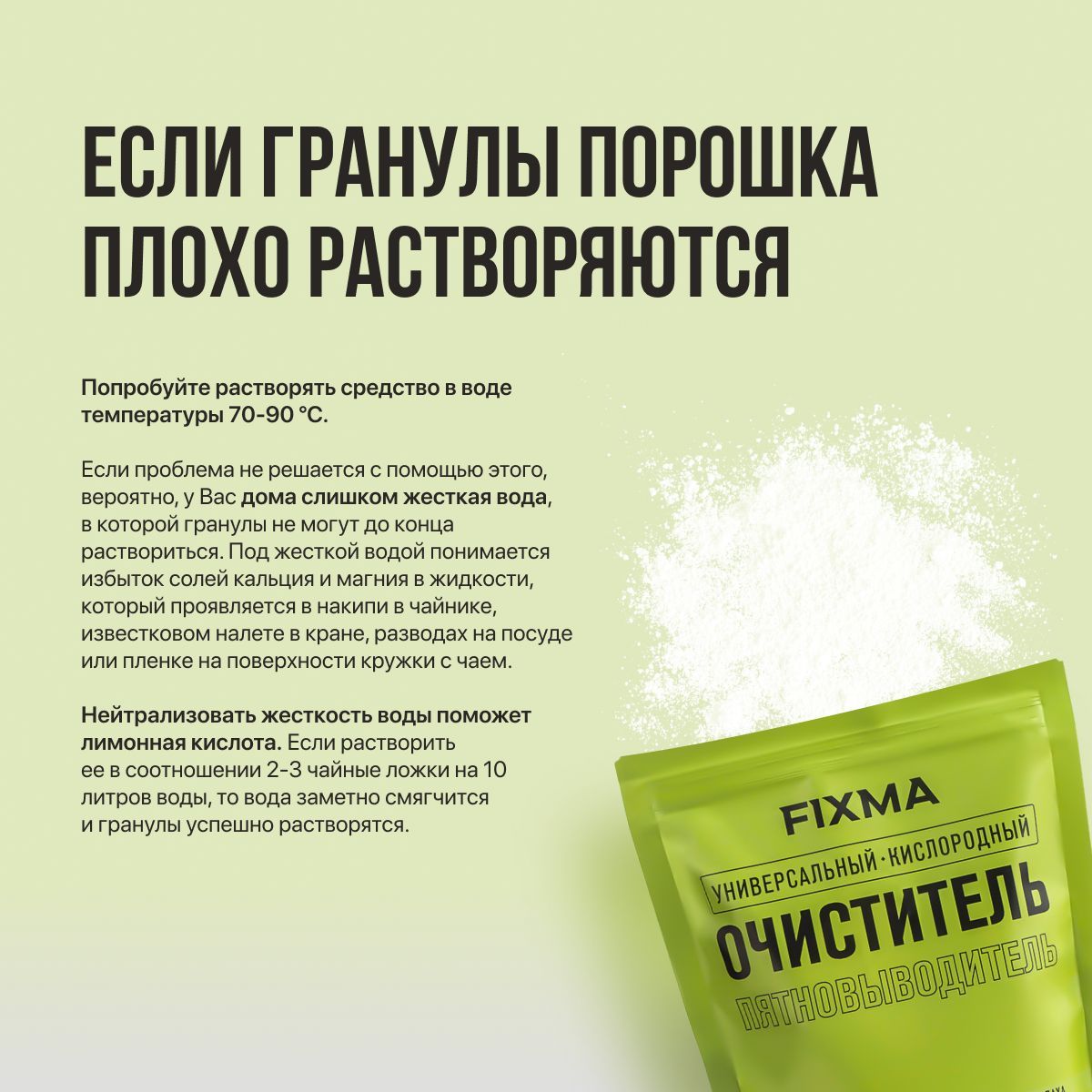 Если гранулы порошка плохо растворяютсяПопробуйте растворять средство в воде температуры 70-90 °C. Если проблема не решается с помощью этого, вероятно, у Вас дома слишком жесткая вода, в которой гранулы не могут до конца раствориться. Под жесткой водой понимается избыток солей кальция и магния в жидкости, который проявляется в накипи в чайнике, известковом налете в кране, разводах на посуде или пленке на поверхности кружки с чаем.