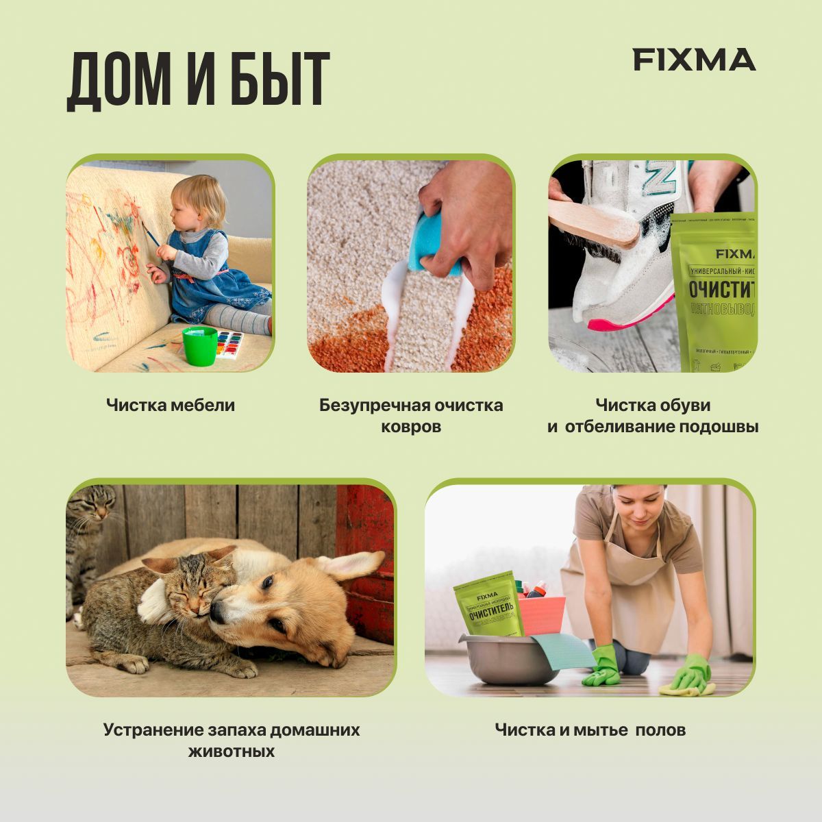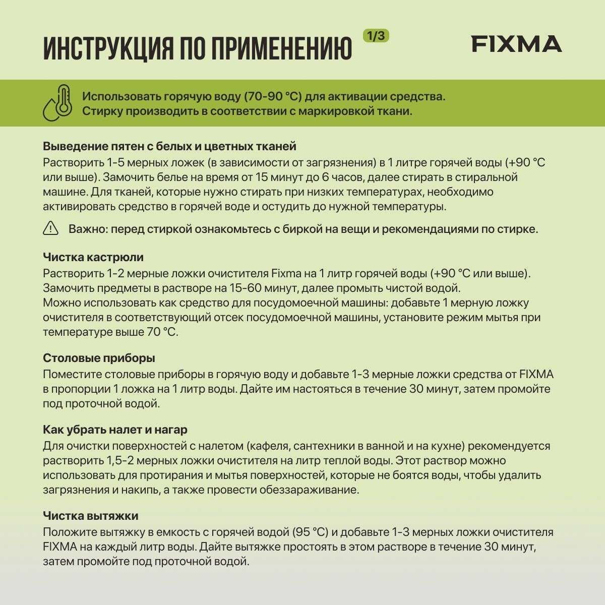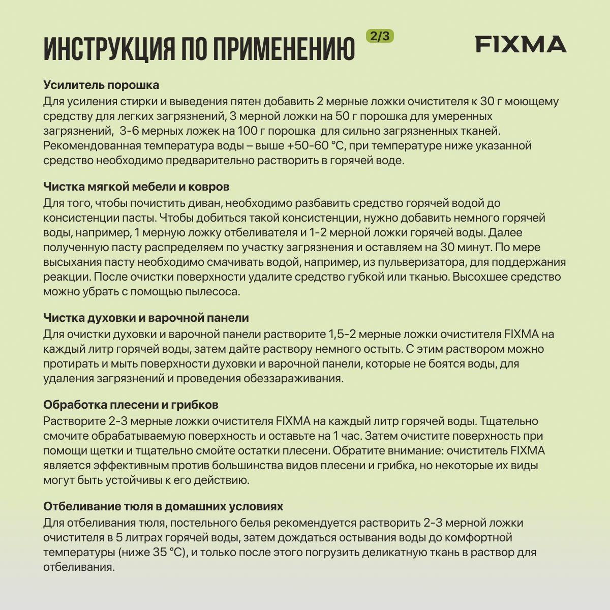 Можно использовать как средство для посудомоечной машины: добавьте 1 мерную ложку очистителя в соответствующий отсек посудомоечной машины, установите режим мытья при температуре выше 70 °C.Столовые приборыПоместите столовые приборы в горячую воду и добавьте 1-3 мерные ложки средства от FIXMA в пропорции 1 ложка на 1 литр воды. Дайте им настояться в течение 30 минут, затем промойте под проточной водой.Как убрать налет и нагарДля очистки поверхностей с налетом (кафеля, сантехники в ванной и на кухне) рекомендуется растворить 1,5-2 мерных ложки очистителя на литр теплой воды. Этот раствор можно использовать для протирания и мытья поверхностей, которые не боятся воды, чтобы удалить загрязнения и накипь, а также провести обеззараживание.Усилитель порошкаДля усиления стирки и выведения пятен добавить 2 мерные ложки очистителя к 30 г моющему средству для легких загрязнений, 3 мерной ложки на 50 г порошка для умеренных загрязнений, 3-6 мерных ложек на 100 г порошка для сильно загрязненных тканей. Рекомендованная температура воды – выше +50-60 °C, при температуре ниже указанной средство необходимо предварительно растворить в горячей воде.Чистка мягкой мебели и ковровДля того, чтобы почистить диван, необходимо разбавить средство горячей водой до консистенции пасты. Чтобы добиться такой консистенции, нужно добавить немного горячей воды, например, 1 мерную ложку отбеливателя и 1-2 мерной ложки горячей воды. Далее полученную пасту распределяем по участку загрязнения и оставляем на 30 минут. По мере высыхания пасту необходимо смачивать водой, например, из пульверизатора, для поддержания реакции. После очистки поверхности удалите средство губкой или тканью. Высохшее средство можно убрать с помощью пылесоса.Чистка духовки и варочной панелиДля очистки духовки и варочной панели растворите 1,5-2 мерные ложки очистителя FIXMA на каждый литр горячей воды, затем дайте раствору немного остыть. С этим раствором можно протирать и мыть поверхности духовки и варочной панели, которые не боятся воды, для удаления загрязнений и проведения обеззараживания.Чистка вытяжкиПоложите вытяжку в емкость с горячей водой (95 °C) и добавьте 1-3 мерных ложки очистителя FIXMA на каждый литр воды. Дайте вытяжке простоять в этом растворе в течение 30 минут, затем промойте под проточной водой.