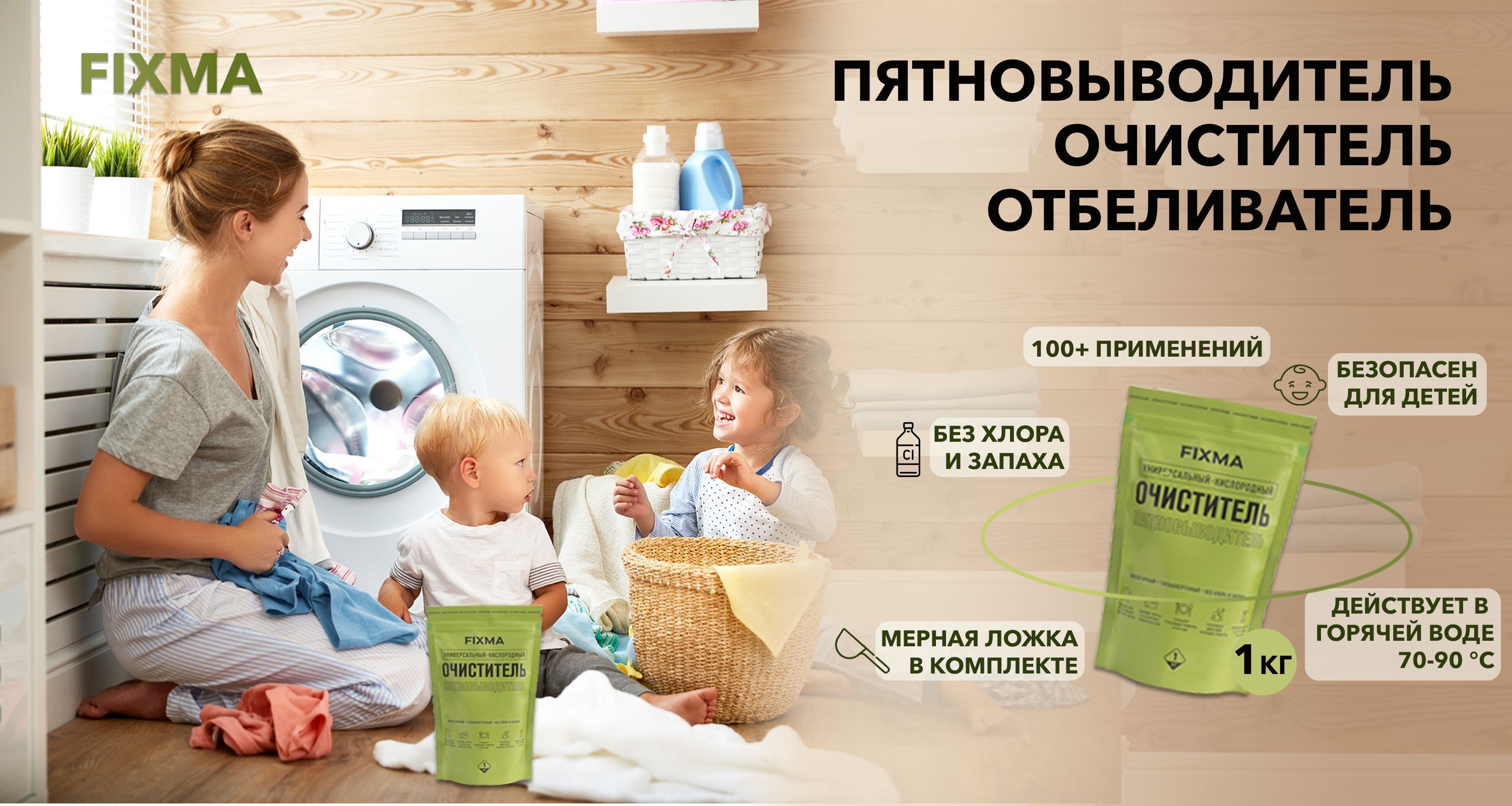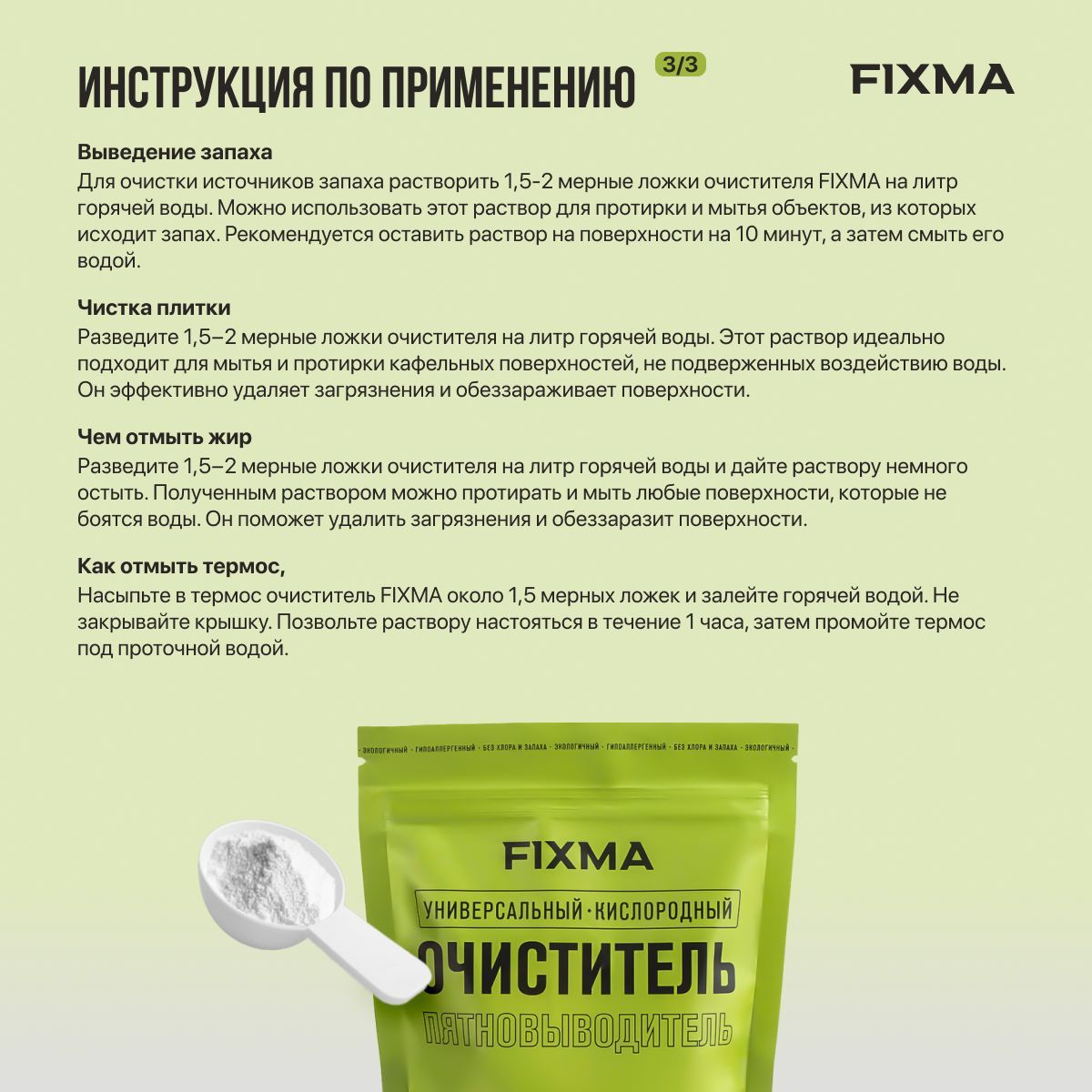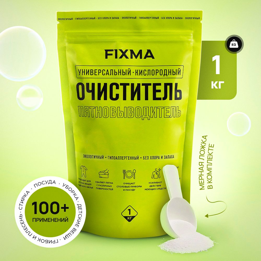 Обработка плесени и грибковРастворите 2-3 мерные ложки очистителя FIXMA на каждый литр горячей воды. Тщательно смочите обрабатываемую поверхность и оставьте на 1 час. Затем очистите поверхность при помощи щетки и тщательно смойте остатки плесени. Обратите внимание: очиститель FIXMA является эффективным против большинства видов плесени и грибка, но некоторые их виды могут быть устойчивы к его действию.Отбеливание тюля в домашних условияхДля отбеливания тюля, постельного белья рекомендуется растворить 2-3 мерной ложки очистителя в 5 литрах горячей воды, затем дождаться остывания воды до комфортной температуры (ниже 35 °C), и только после этого погрузить деликатную ткань в раствор для отбеливания.Выведение запахаДля очистки источников запаха растворить 1,5-2 мерные ложки очистителя FIXMA на литр горячей воды. Можно использовать этот раствор для протирки и мытья объектов, из которых исходит запах. Рекомендуется оставить раствор на поверхности на 10 минут, а затем смыть его водой.Чистка плиткиРазведите 1,5−2 мерные ложки очистителя на литр горячей воды. Этот раствор идеально подходит для мытья и протирки кафельных поверхностей, не подверженных воздействию воды. Он эффективно удаляет загрязнения и обеззараживает поверхности.Чем отмыть жирРазведите 1,5−2 мерные ложки очистителя на литр горячей воды и дайте раствору немного остыть. Полученным раствором можно протирать и мыть любые поверхности, которые не боятся воды. Он поможет удалить загрязнения и обеззаразит поверхности.Как отмыть термосНасыпьте в термос очиститель FIXMA около 1,5 мерных ложек и залейте горячей водой. Не закрывайте крышку. Позвольте раствору настояться в течение 1 часа, затем промойте термос под проточной водой.Активируется горячей водойПри соприкосновении с горячей водой (70-90°) формула начинает активную выработку кислорода и борьбу с пятнами. Если же вещь требуется стирать в более прохладной воде (30-60°), то рекомендуем добавить средство в отсек к порошку или оставить вещь замоченной в мыльном растворе (из расчета 0,5-2 мерные ложки на 1л) на время до 6 часов. Время замачивания зависит от материала, глубины и срока давности пятна.Не используйте очиститель  с этими материаламиКожа