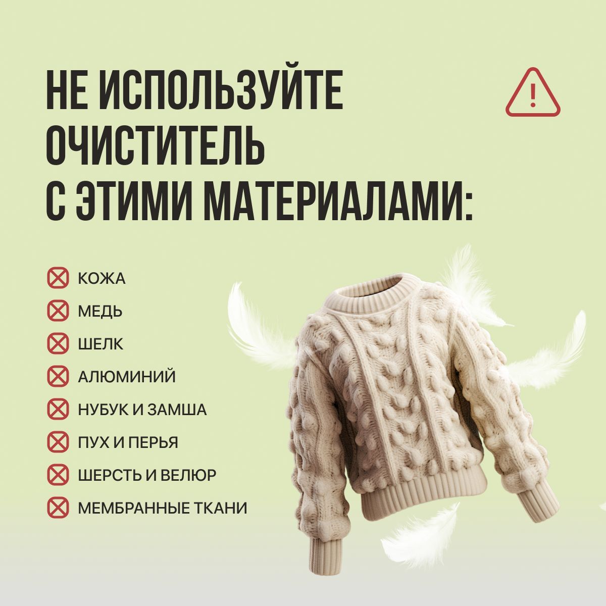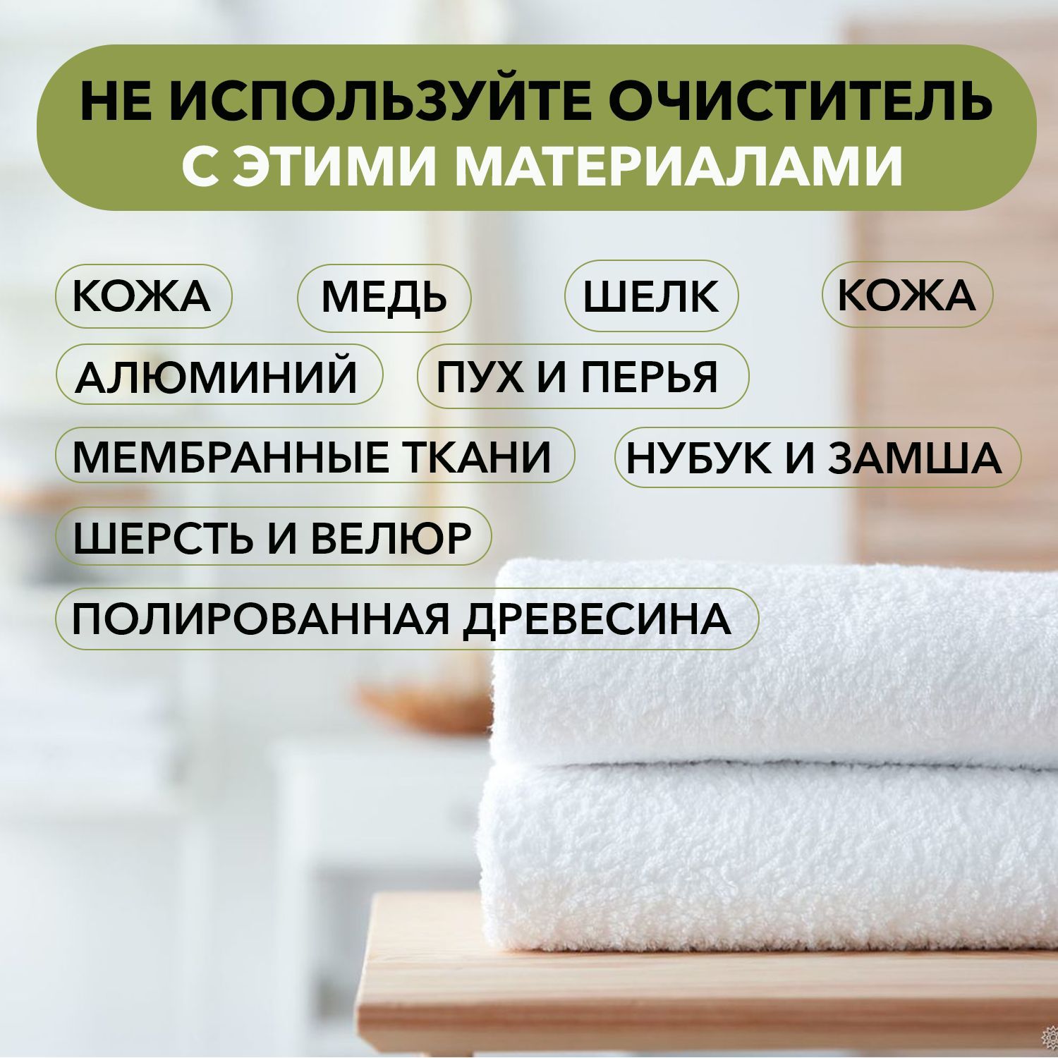 Обратите внимание! Порошок не подходит для стирки шерсти, шелка, натуральной кожи (включая замшу и нубук), пуха и пера, а также мембранных тканей и изделий из алюминия, меди и дерева. Его нельзя смешивать со средствами, содержащими хлор (например, белизной).