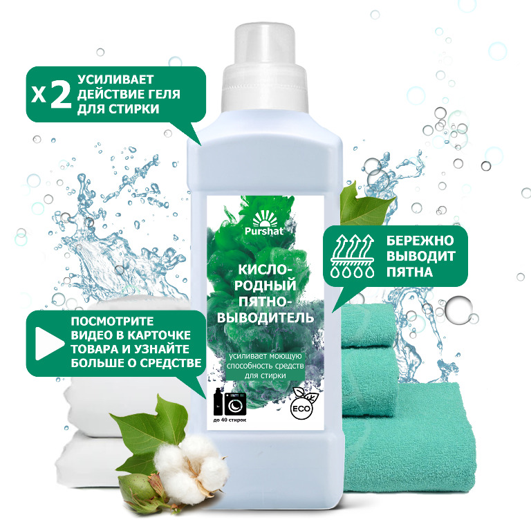 Описание: Кислородный пятновыводитель, отбеливатель и усилитель стирки «Пуршат» (Purshat) эффективно и одновременно бережно воздействует на загрязнения, сохраняя структуру материала. Он подходит для всех видов тканей.