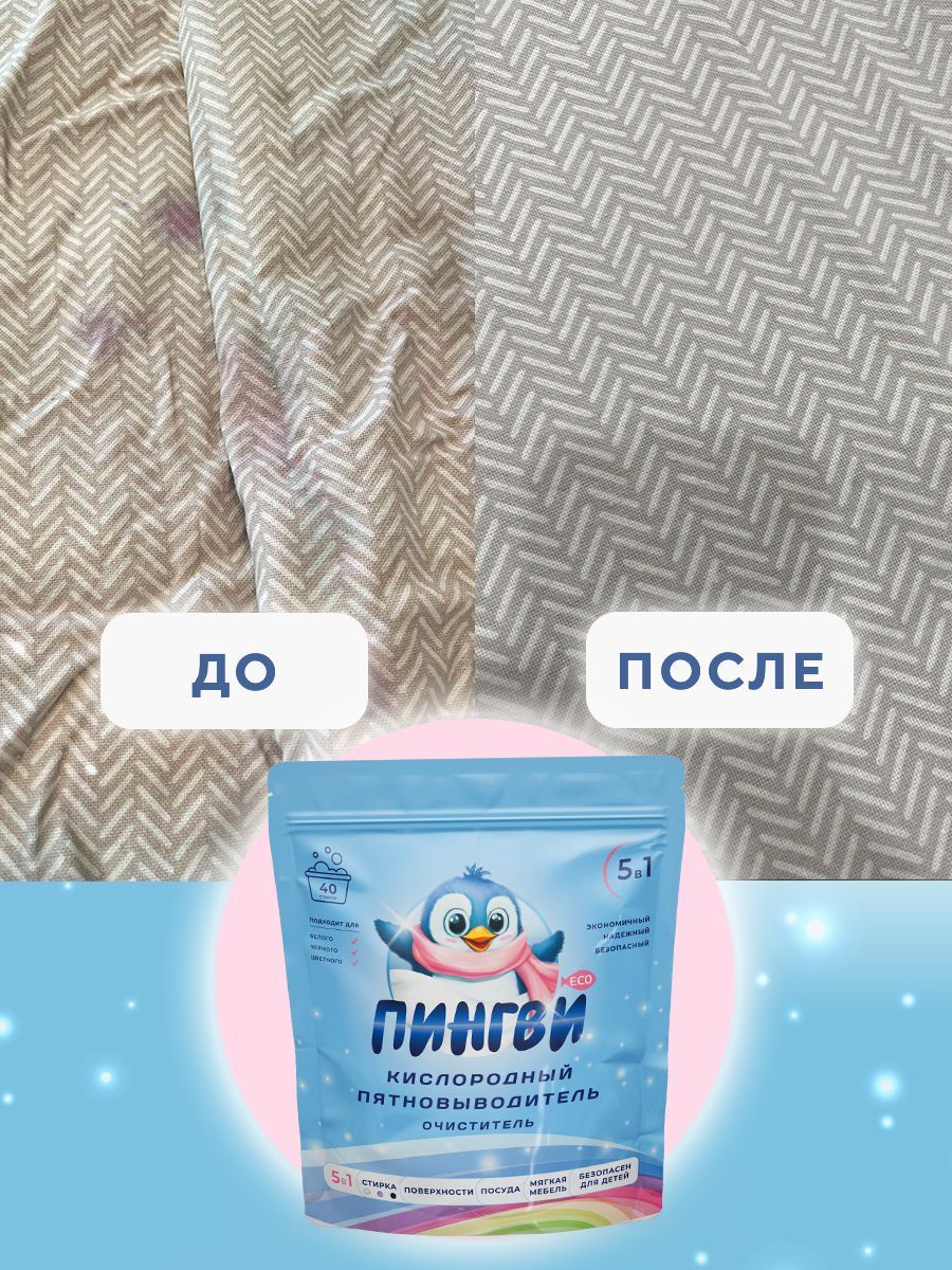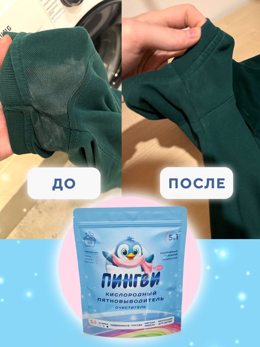 Описание: ЭФФЕКТИВНЫЙ КИСЛОРОДНЫЙ ПЯТНОВЫВОДИТЕЛЬ И ОТБЕЛИВАТЕЛЬ «ПИНГВИ ЭКО»Гранулы порошка деликатно отстирывают устаревшие и въевшиеся загрязнения, органического происхождения и пятна от растений, на белом, цветном и черном белье. А именно, от травы, одуванчиков, пыльцы, следы пищи и напитков (в т.ч. детского прикорма, сока, кофе, чая), пота, земли, крови, лекарственных препаратов (марганцовки, зеленки), фломастеров, карандашей, жирной пищи и многое другое – при этом сохраняя первоначальную структуру и цвет вещей.ЭКОНОМНЫЙ РАСХОД БЕЗОПАСНОГО ОЧИСТИТЕЛЯ В комплекте с пятновыводителем прилагается удобная ложка-дозатор, которая позволит точно отмерить необходимое количество чудо порошка, а zip lock застежка защитит от влаги. «Пингви Эко» является бестселлером в категории бытовая химия, благодаря большому количеству отзывов – проверенное и надежное средство. ЭКОЛОГИЧЕН И БЕЗОПАСЕН ДЛЯ ЖИВОТНЫХ И ОКРУЖАЮЩЕЙ СРЕДЫБезопасен и экологичен для чистки вещей домашних животных, надежно устраняет неприятные запахи и источник их распространения.
