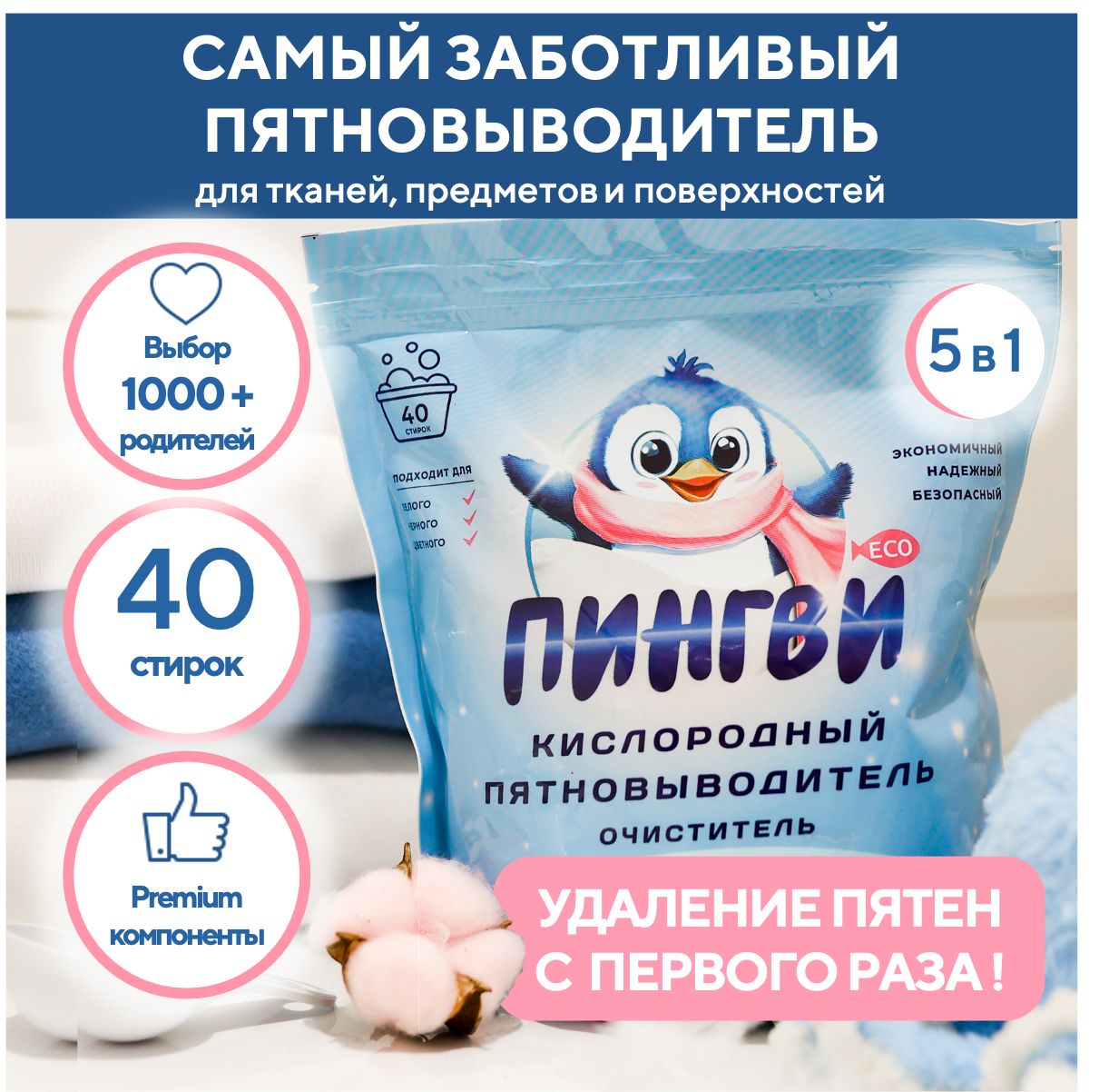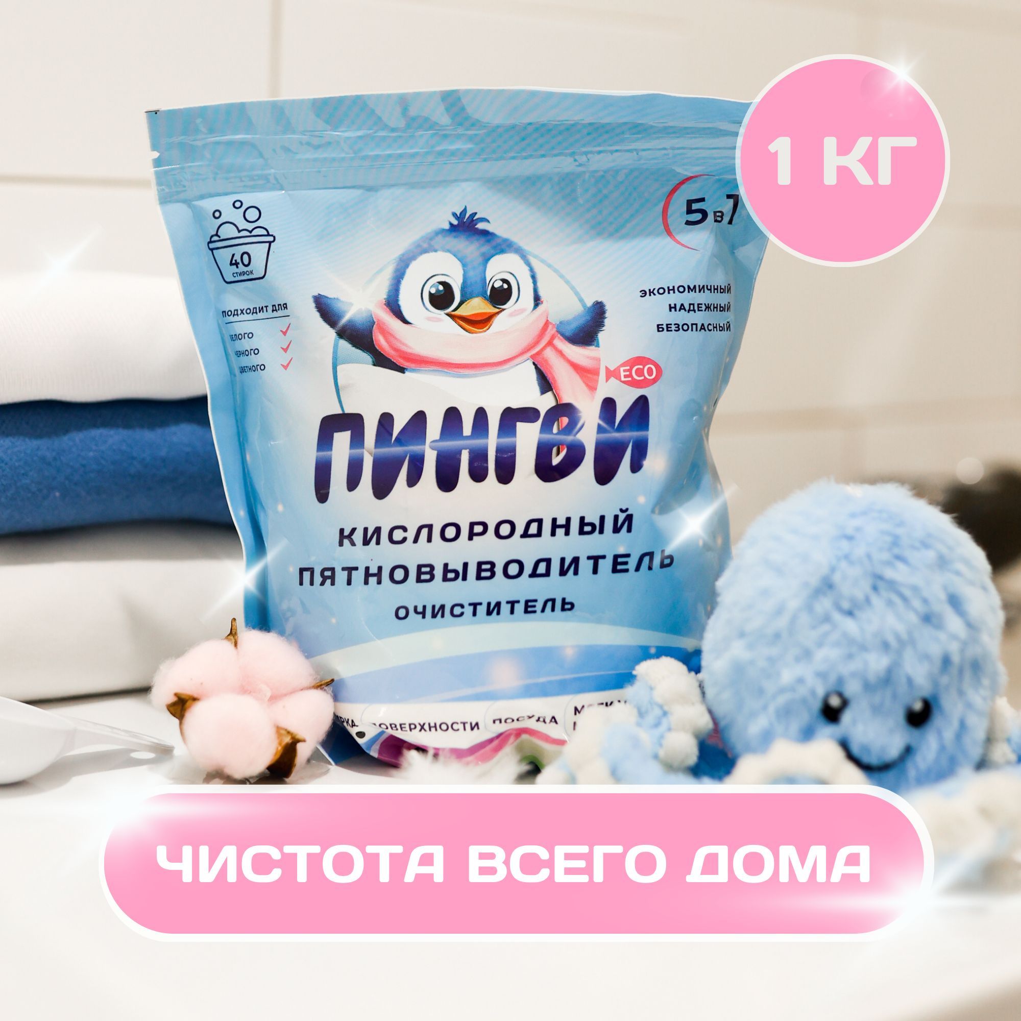 Кислородный пятновыводитель "Пингви Эко" 1 кг, отбеливатель для белого, цветного и детского белья, чудо очиститель универсальный экологичный, перкарбонат натрия 100%