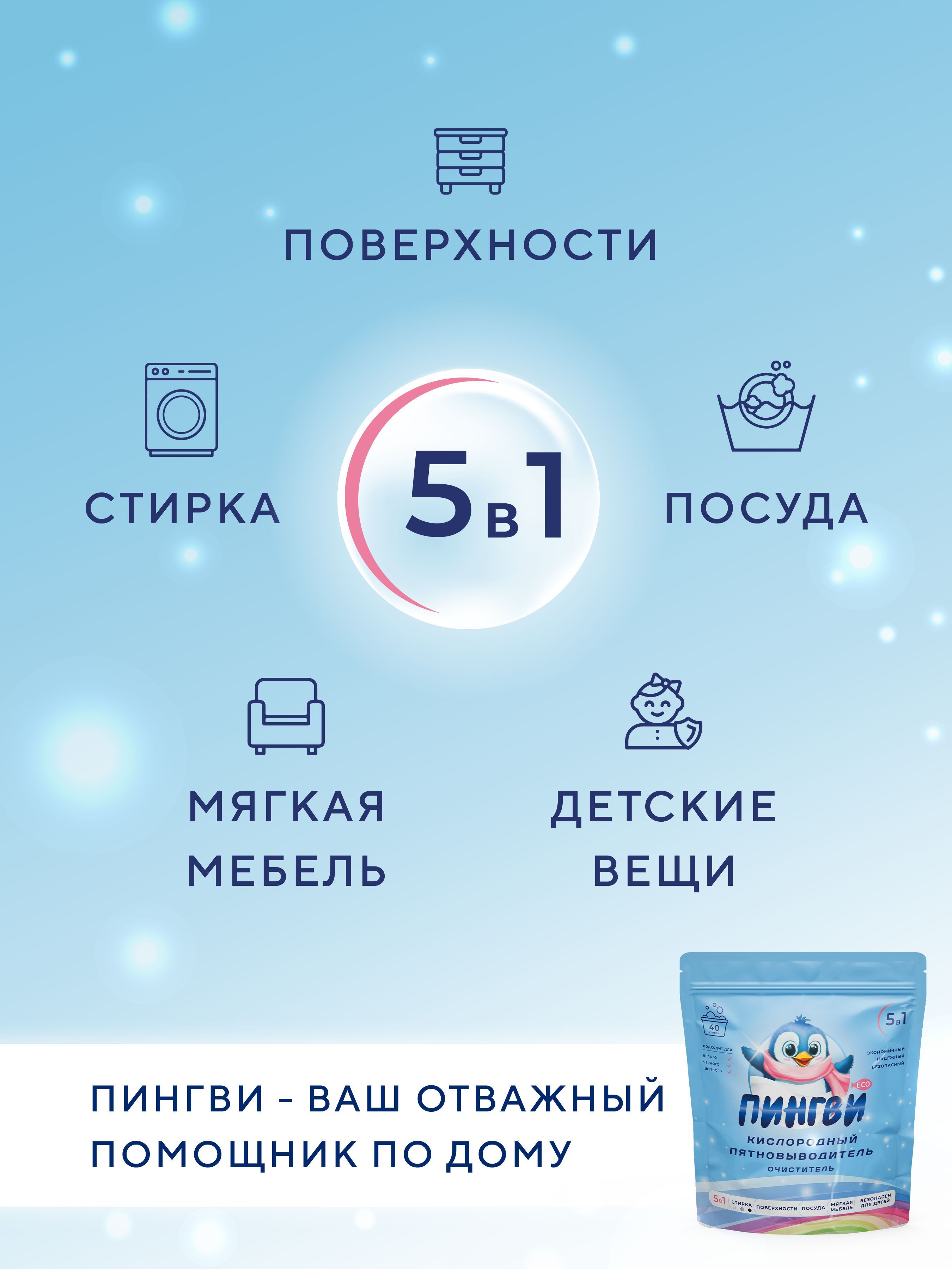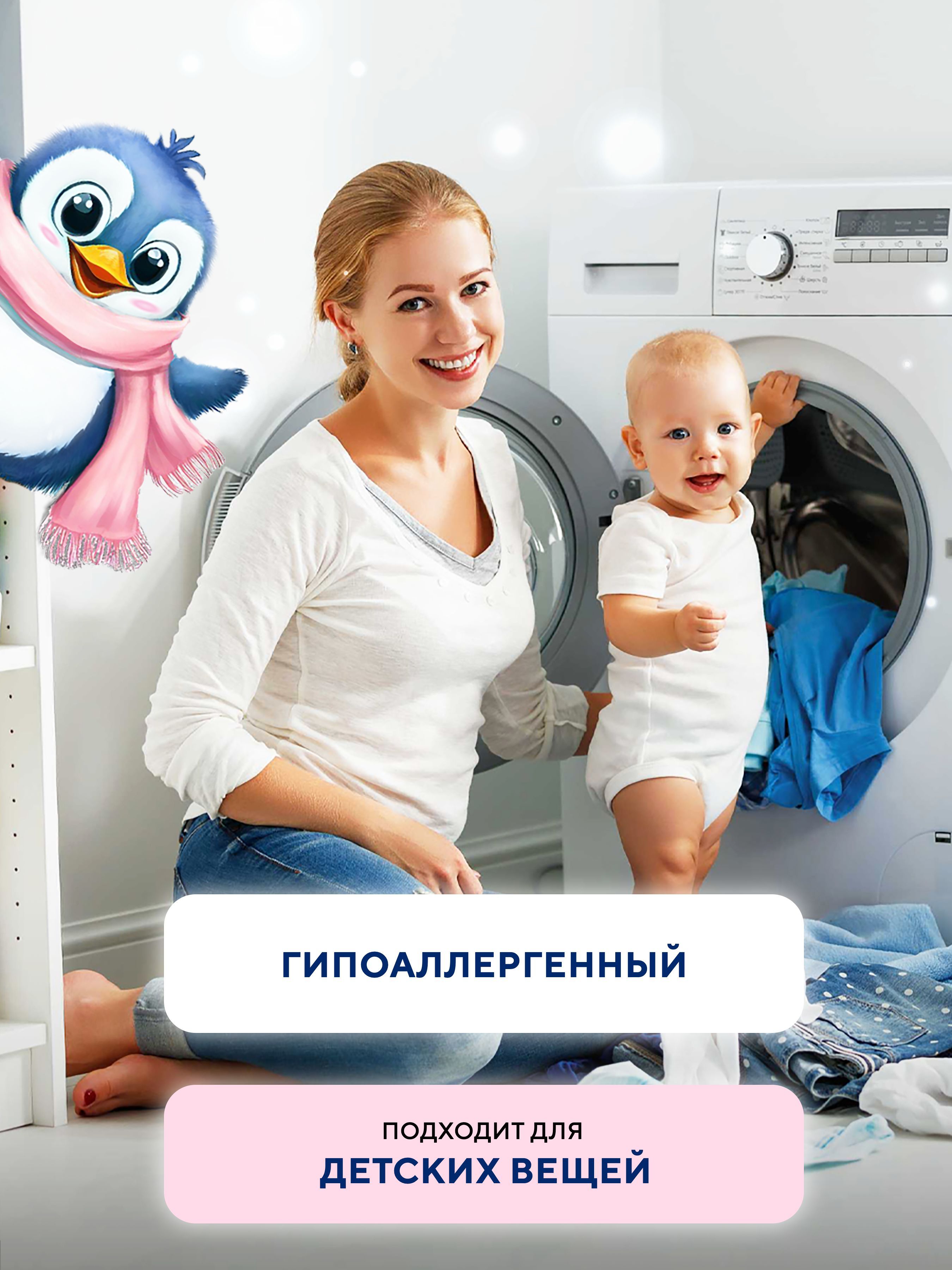«ПИНГВИ ЭКО» ГИПОАЛЛЕРГЕНЕН И БЕЗОПАСЕН ДЛЯ ДЕТЕЙНе содержит хлора и не вызывает аллергической реакции. Безопасен для стирки детских вещей, очищения обуви и игрушек. Эко очиститель при контакте с водой распадается на кислород, воду и соду. Кислород отбеливает, очищает и устраняет неприятные запахи. А сода смягчает воду, что улучшает эффективность средства.
