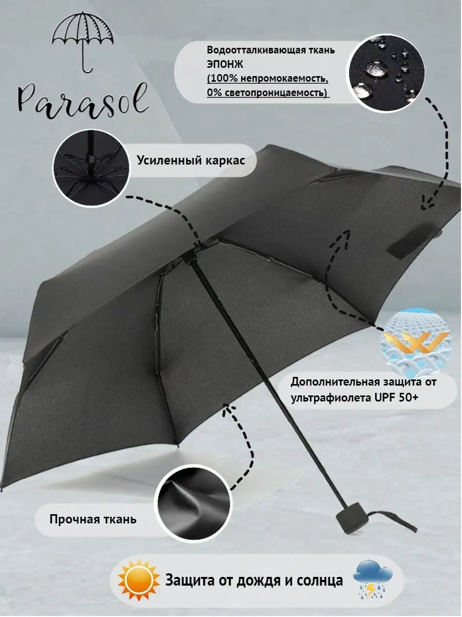 Доп. опции зонта Система антиветер, дополнительная защита от ультрафиолета, антикоррозийное покрытие; Чехол в комплекте, мини зонт,; Защита от солнца, антикоррозийное покрытие спиц, прочный,