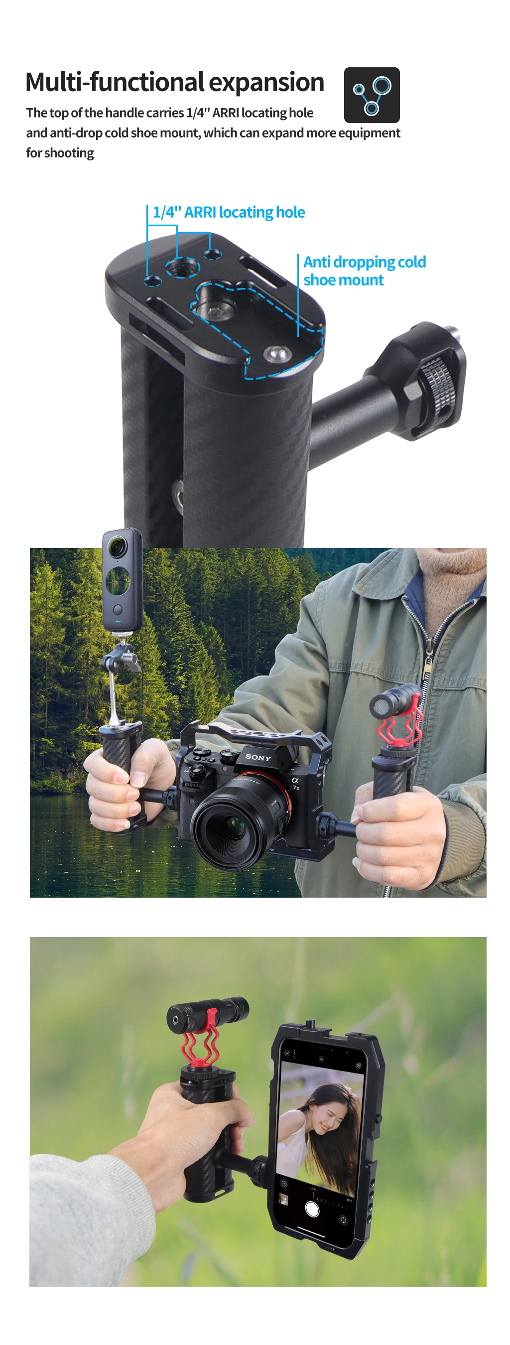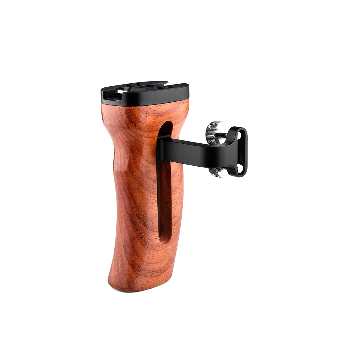 • Эргономичная рукоятка изготовлена из твердого бразильского дерева и прочного алюминия, и она крепится на решетку камеры с помощью стандартного ARRI rosette male M6 резьбового винта, который позволяет вращаться на 360 °.