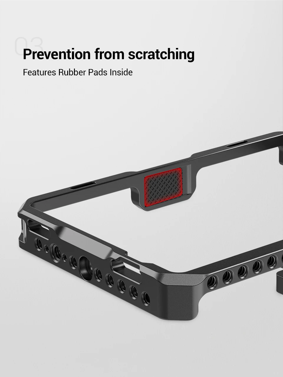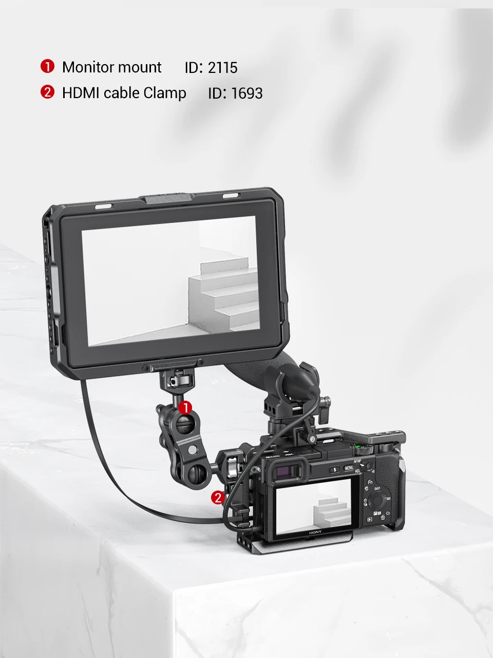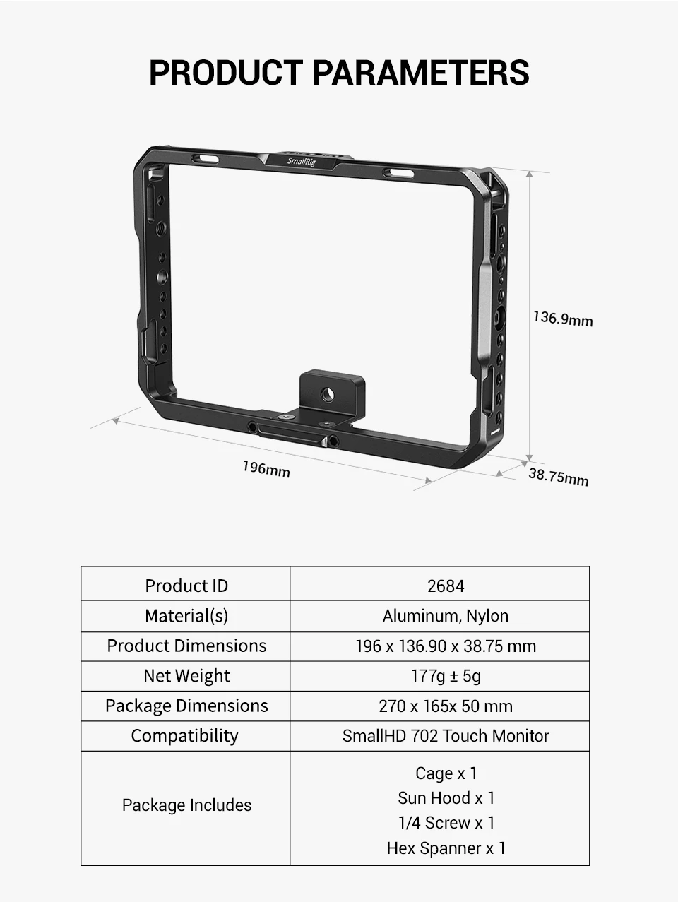 SmallRig Cage with Sun Hood for SmallHD 702 Touch Monitor CMS2684 is designed to provide all-around protection and accessory mounts for the monitor. The cage secures to the monitor via three 1/4”-20 screws, with one on the top and bottom, and one on the back. Featuring multiple 1/4’’-20 and ARRI 3/8’’-16 threads allows for mounting accessories such as Magic Arm 2115, Monitor Mount BSE2348 and Wireless Receiver Bracket 2107. The bottom features a NATO rail for NATO clamp compatible accessories to quickly release your setup, such as Monitor Mount BSE2385. Dedicated sun hood is included to provide glare protection when shooting outdoor. The backplate is compatible with V-Lock Battery Mount 1846 to attach a V Mount battery. Features multiple rubber pads inside to prevent the monitor from scratching.