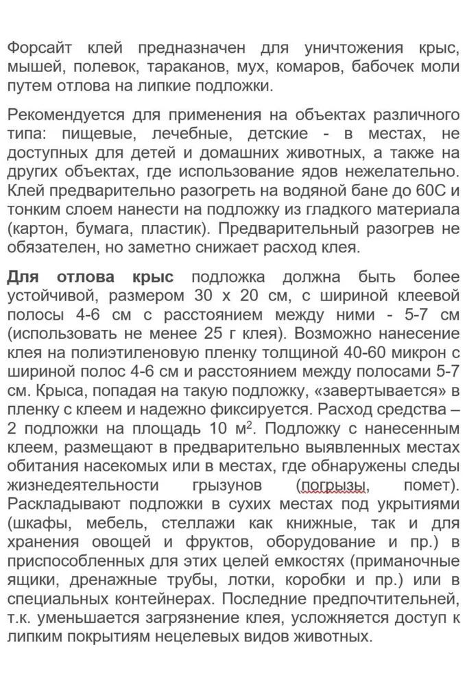Описание: «Форссайт клей» предназначено для уничтожения тараканов, мух, комаров, бабочек моли, крыс, мышей и полевок путем отлова на липкие подложки персоналом организаций, имеющих право заниматься дезинфекционной деятельностью, а также населением в быту.
