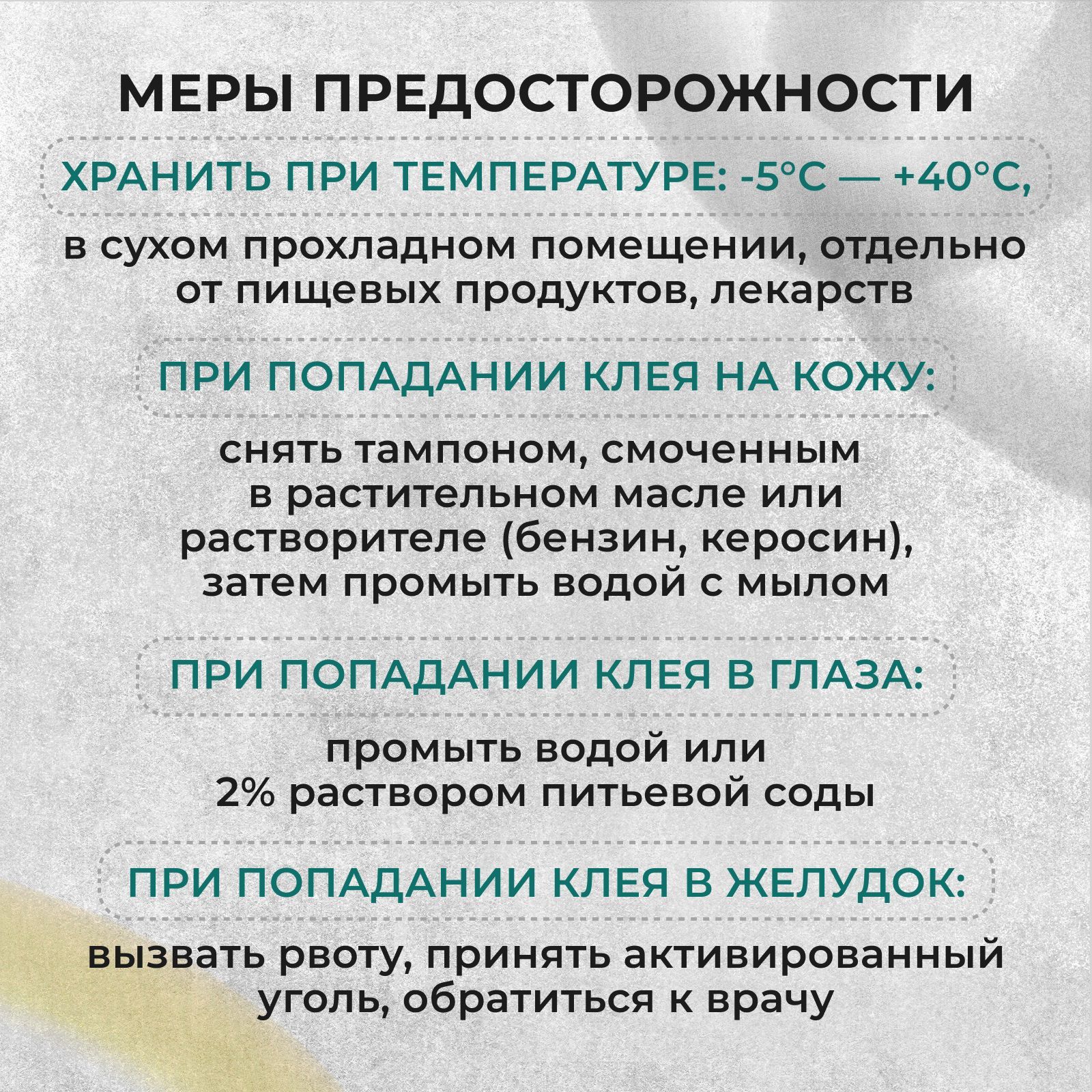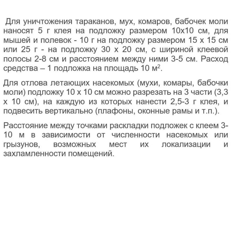 КРЫСЫ Для отлова крыс подложка должна быть более устойчивой, размером 30 х 20 см, с шириной клеевой полосы 4-6 см с расстоянием между ними - 5-7 см (использовать не менее 25 г клея). Возможно нанесение клея на полиэтиленовую пленку толщиной 40-60 микрон с шириной полос 4-6 см и расстоянием между полосами 5-7 см. Крыса, попадая на такую подложку, «завертывается» в пленку с клеем и надежно фиксируется. Расход средства – 2 подложки на площадь 10 м2. КОМАРЫ Для отлова летающих насекомых (мухи, комары, бабочки моли) подложку 10 х 10 см можно разрезать на 3 части (3,3 х 10 см), на каждую из которых нанести 2,5-3 г клея, и подвесить вертикально (плафоны, оконные рамы и т.п.). Расстояние между точками раскладки подложек с клеем 3-10 м в зависимости от численности насекомых или грызунов, возможных мест их локализации и захламленности помещений.