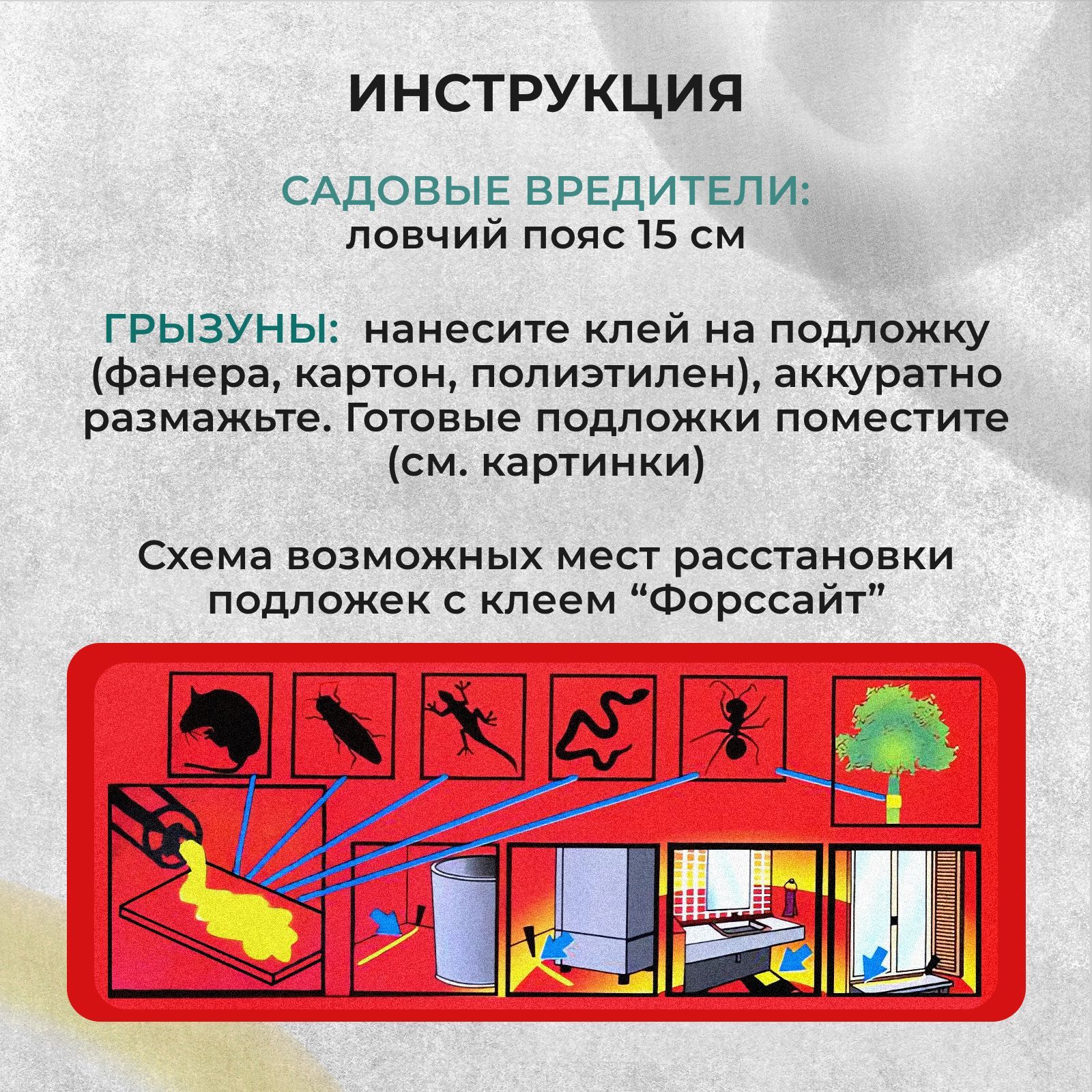 КУДА РАСКЛАДЫВАТЬ ЛОВУШКИ?Подложку с нанесенным клеем, размещают в предварительно выявленных местах обитания насекомых или в местах, где обнаружены следы жизнедеятельности грызунов (погрызы, помет). Раскладывают подложки в сухих местах под укрытиями (шкафы, мебель, стеллажи как книжные, так и для хранения овощей и фруктов, оборудование и пр.) в приспособленных для этих целей емкостях (приманочные ящики, дренажные трубы, лотки, коробки и пр.) или в специальных контейнерах. Последние предпочтительней, т.к. уменьшается загрязнение клея, усложняется доступ к липким покрытиям нецелевых видов животных.