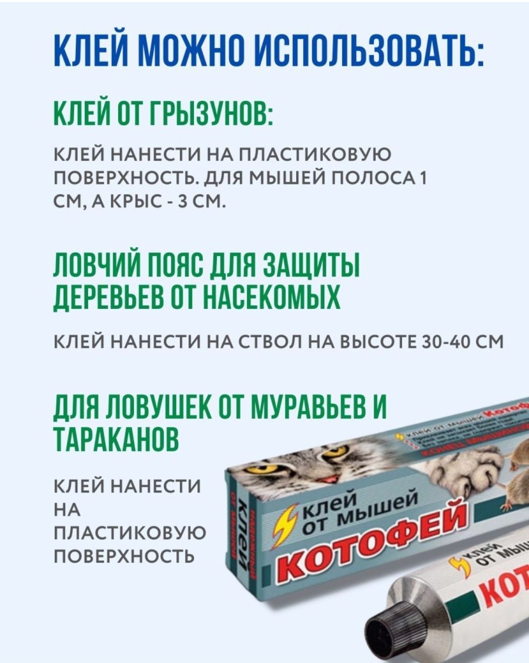 Описание: Клей "Котофей", от мышей и крыс, 135 г. Клей ''Котофей'' - нетоксичное средство для отлова и уничтожения мышей и мелких крыс. В некоторых случаях применение отравленных приманок или мышеловок невозможно или нежелательно. В этом случае отличные результаты дает применение специального клея. Клей ''Котофей'' предназначен для отлова мышей и мелких крыс, обладает замечательными клеящими свойствами, надежно фиксирует ''влипших'' грызунов. Не содержит токсичных веществ, не пахнет, не отпугивает грызунов запахом. Легко наносится на подложки, имеет оптимальную консистенцию, не растекается. В ''намазанном'' виде очень, очень долгое время не высыхает, не покрывается коркой и не теряет своих свойств. Прекрасно ловит мышей как в сухих, так и во влажных помещениях, а также вне помещений. (Клеящие свойства немного снижаются лишь на морозе).Состав: полибутилен, полиизобутилен.Применение: клей наносят тонким слоем на пластиковые, картонные и другие подложки из гладкого материала.