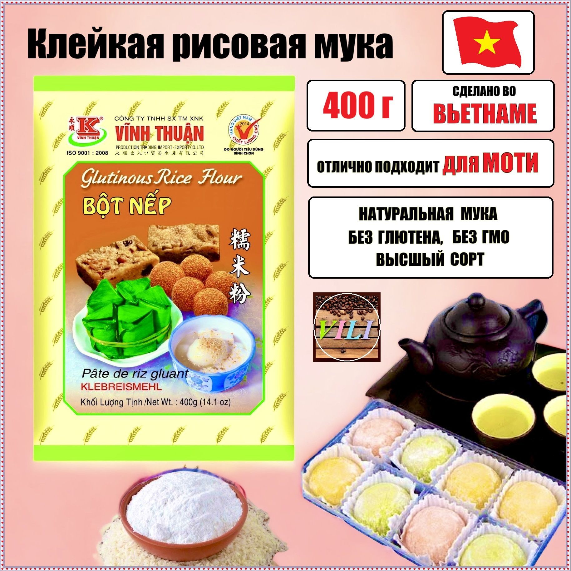Клейкая рисовая мука для моти, токпокки, десертов VINH THUAN, 1шт по 400 гр