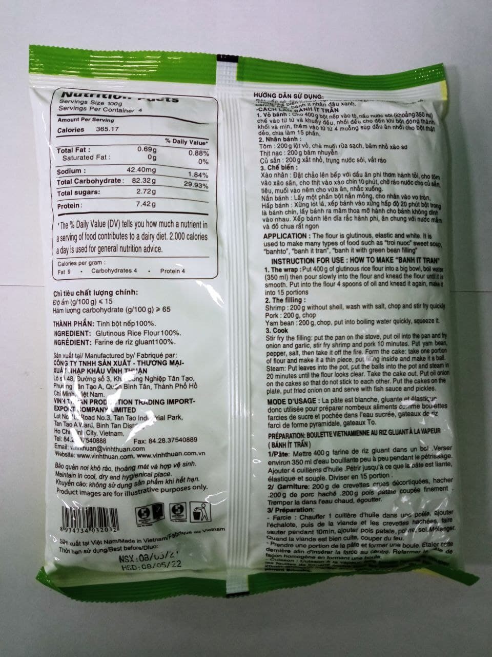 Мука клейкая рисовая Vinh Thuan производится из 100%-ного клейкого риса и имеет белый цвет.