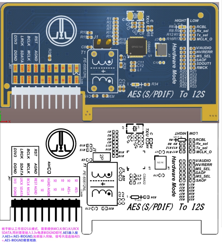 AES является двухсторонним дифференциальным входом, в то время как коаксиальный SPDIF является односторонним входом. При вводе коаксиального кабеля подключите клемму AES +, и клемму AES необходимо Заземлить. Когда сигнал вводится и блокируется. Светодиод на плате загорится, в противном случае проверьте проводку 12S или проверьте, правильно ли клемма AES (на коаксиальном входе) подключена к проводу заземления. Провод слишком плохой или слишком длинный.