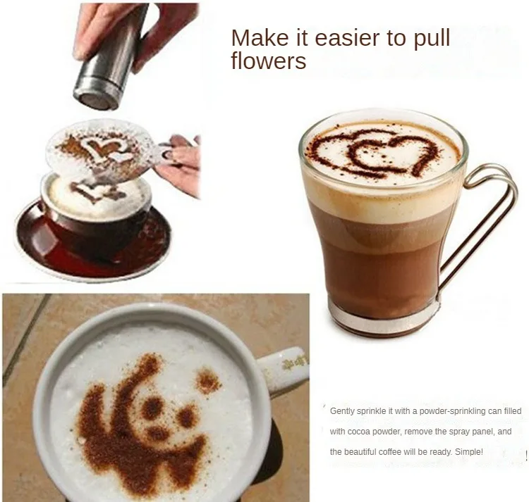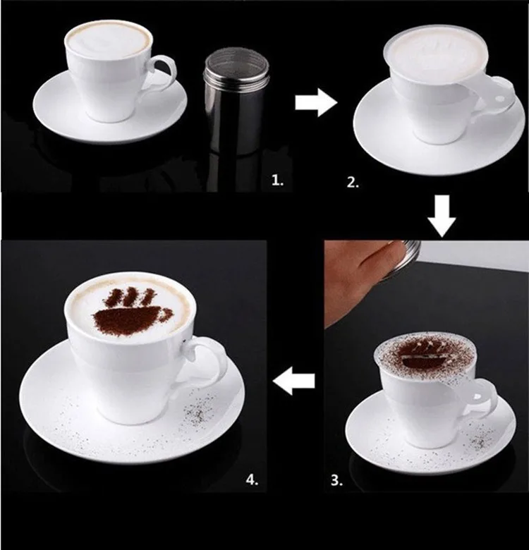Кофе, искусство капучино, латте, стержни из нержавеющей стали с вырезанными узорами или рисунками на деревом кофе