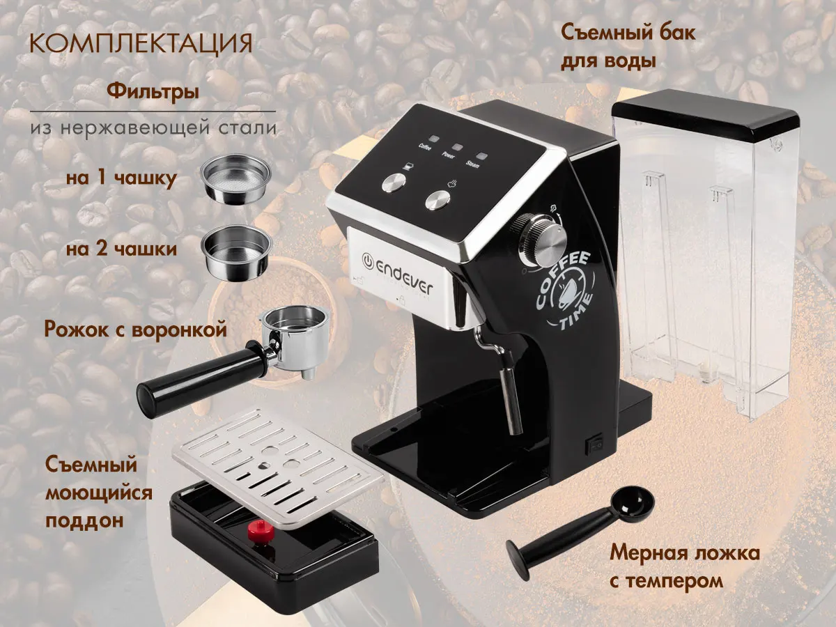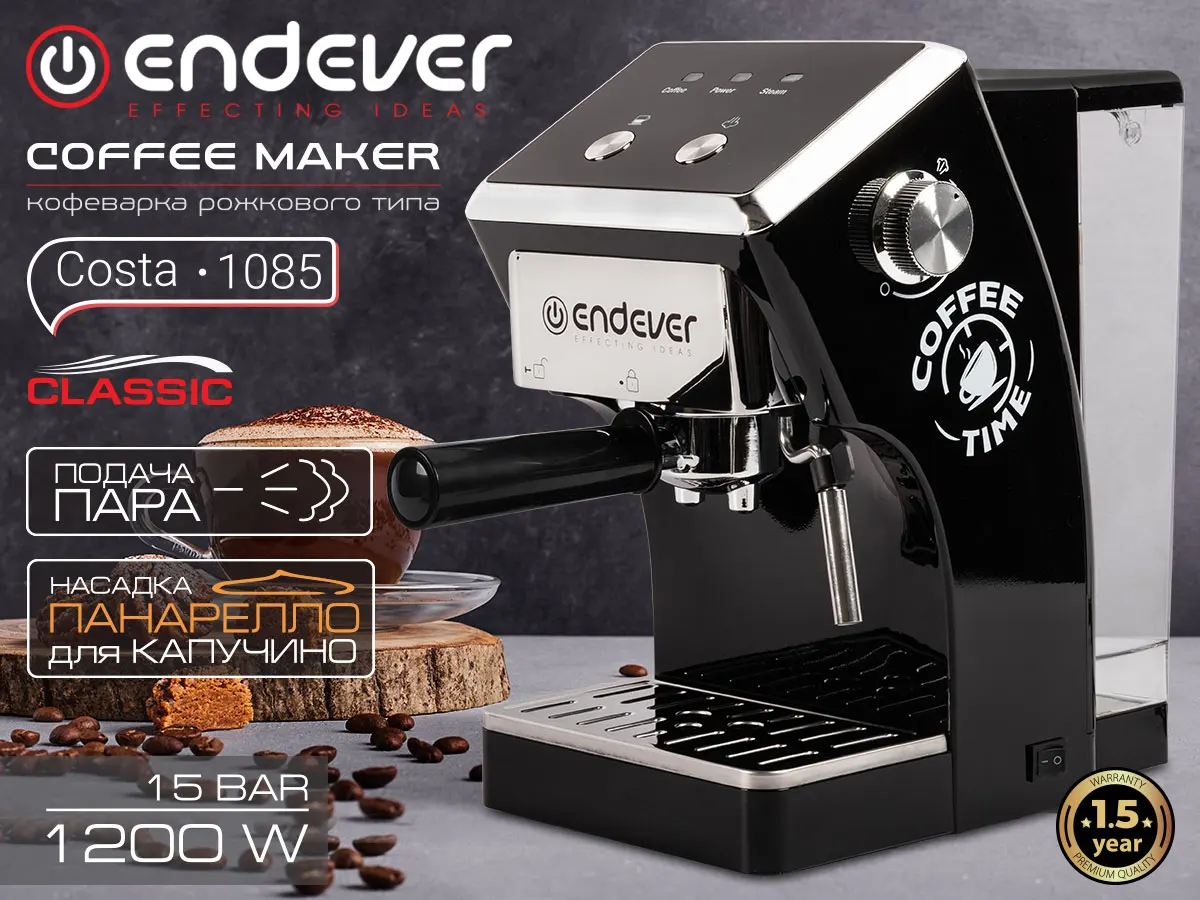Кофеварка рожкового типа электрическая Endever Costa-1085, объем-1,5л, цвет черный, мощность 1200 Вт, давление 15 бар