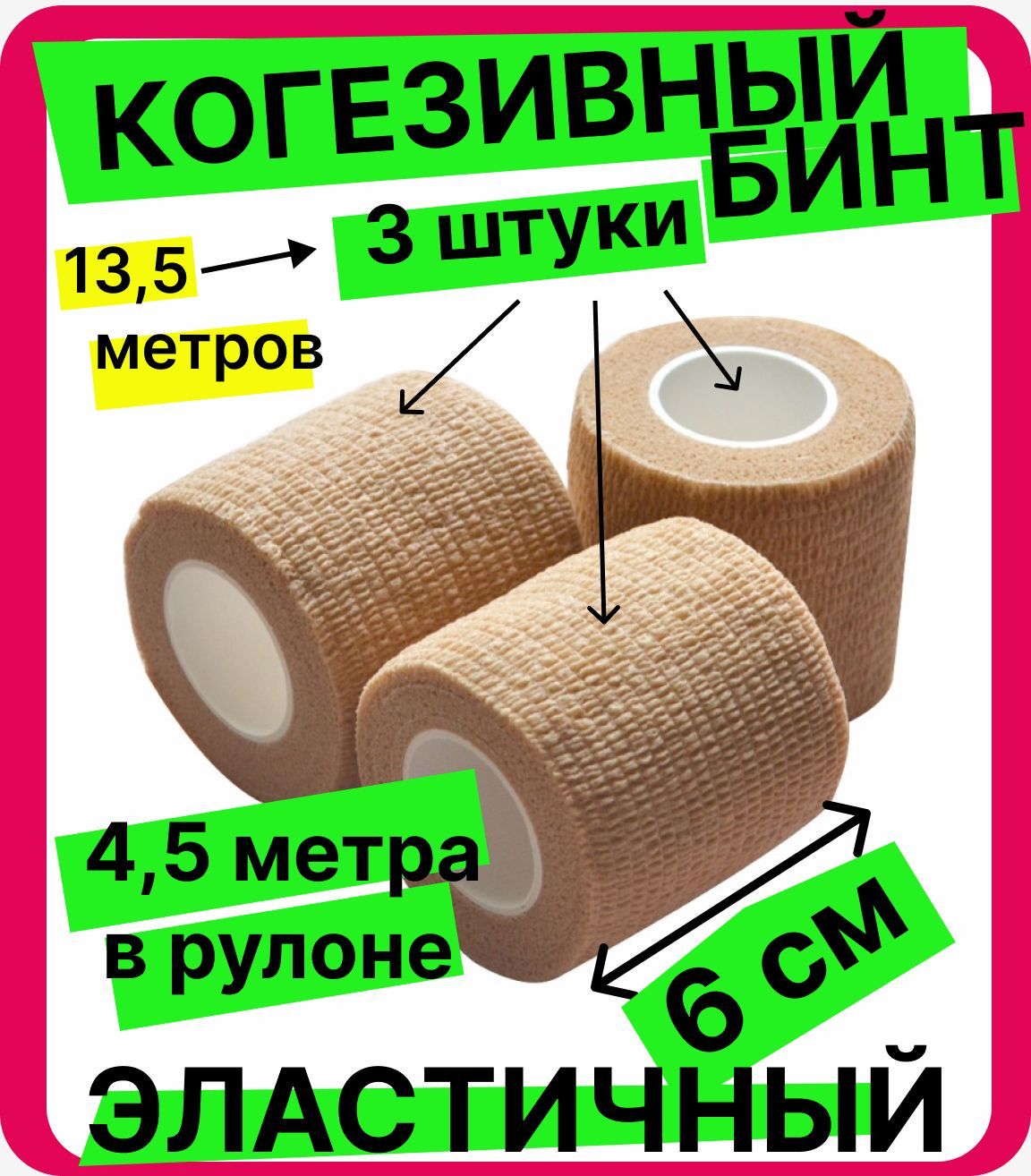 Эластичный самофиксирующийся бинт обеспечивает надежную компрессию в течение длительного времени, не допуская относительного смещения и скручивания витков. Бинт спортивный фиксируется за счет особой структуры ткани, благодаря чему в использовании скоб и шпилек нет необходимости. Эластичный когезивный бинт не приклеивается к коже, волосам и одежде, не раздражает кожу и не требует завязывания благодаря особой структуре поверхности бинта, позволяющей последующему слою цепляться за предидущий. Бинт бандажный - 3 шт. Бинт эластичный, когезивный, самофиксирующийся. Ширина 6 см, длина 13,5 м. Предназначен для фиксации частей машинок для тату, перманентного макияжа и татуажа. Отлично фиксируется, не скользит. Эластичный самофиксирующийся бинт. Предназначен для фиксации суставов, элементов инвентаря, компрессов. Без клеевой основы и надежно крепится сам на себя. Не вызывает раздражений и аллергических реакций. Материал: Полипропилен 93%; Спандекс 7%;. не требует завязывания; легко отрывается вручную под любой размер; не прилипает к коже, волосам и одежде; не сковывает движения; безболезненно снимается с тела; может использоваться многократно; не раздражает кожу; хорошо пропускает воздух; не теряет своих свойств при погружении в воду. Бинт многофункциональный самофиксирующийся эластичный. Бинт не требует дополнительной фиксации. Не прилипает к коже, волосам и шерсти, при этом отлично закрепляется. Воздухопроницаемый - кожа через него может дышать. Используется для животных, в спорте, при травмах и ушибах, а также для фиксации частей машинок для тату, перманентного макияжа и татуажа. Каждый бинт в индивидуальной упаковке Не требует завязывания; Режется под любой размер; Не прилипает к коже, волосам и одежде; Не сковывает движения; Безболезненно снимается с тела; Может использоваться многократно; Нетоксичен; Не раздражает кожу; Хорошо пропускает воздух; Не теряет своих свойств при погружении в воду.й