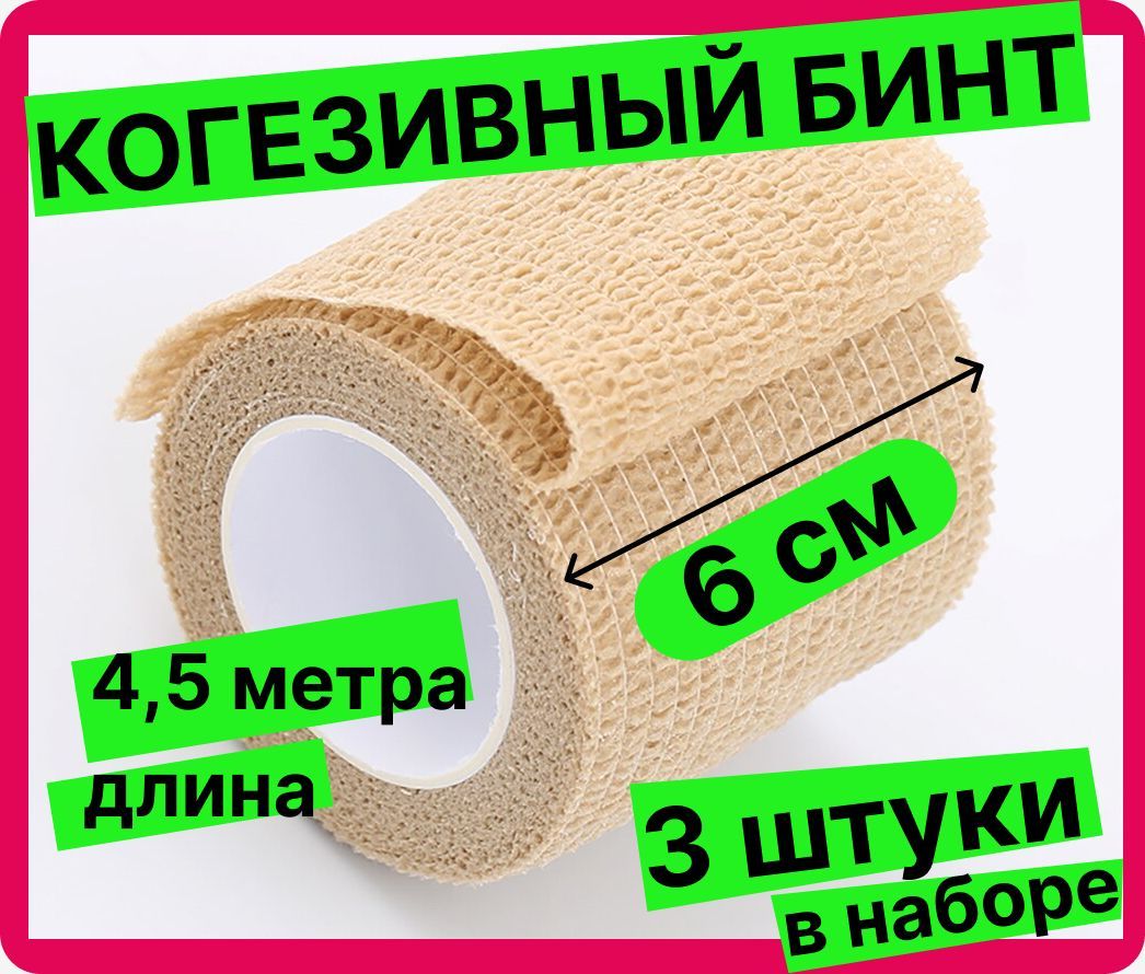 Когезивный бинт эластичный самофиксирующийся бандажный лента тейп для перевязок (ширина 6 см; набор: 3 шт., длина 13,5 метров)