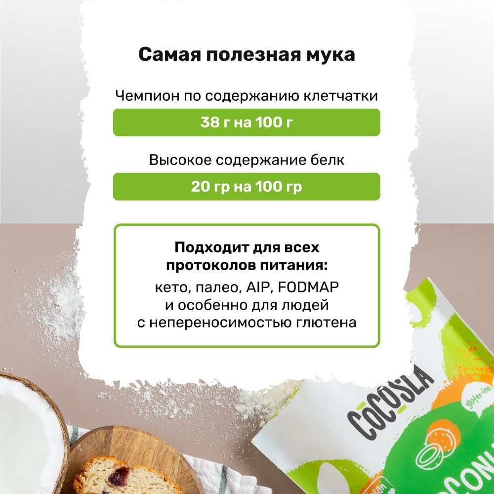 В отличие от традиционной пшеничной муки, кокосовая - абсолютный чемпион по количеству клетчатки.  Мука из кокосовой мякоти содержит 38 г клетчатки на 100 г продукта. Высокое содержание клетчатки или, другими словами, пищевых волокон, делает данный продукт ценным суперфудом, незаменимым продуктом для правильного питания, рациона веганов, приверженцев кето диеты, ЗОЖ, пп и других поклонников экофуда. Продукт с высоким содержанием клетчатки, как кокосовая мука — это низкоуглеводный продукт, отличный кето продукт.  Клетчатка или пищевые волокна относятся к тем самым ценным сложным углеводам. Пищевые волокна не перевариваются и не усваиваются нашим организмом, абсорбируют на себе токсины, скопившиеся в кишечнике, холестерин, простые сахара и выводят их естественным образом, нормализуя тем самым еще и работу ЖКТ. Пшеничная мука, в отличии от низкоуглеводной кокосовой муки лишена клетчатки, и при этом имеет самый высокий гликемический индекс (ГИ). ГИ пшеничной муки – 85, у кокосовой – 45.  Кокосовая кето мука также положительно влияет на сосуды и состав крови, укрепляет зубы, кости и иммунитет. Её состав богат калием, цинком, селеном, магнием и кальцием, витаминами B, C, E и K. А высокое содержание белка в высушенной измельченной мякоти делает ее ценным источником незаменимых аминокислот. Положительным фактом является и то, что в белках кокоса нет глютена, поэтому мука из его мякоти может быть использована в качестве альтернативы пшеничной муке людьми, с непереносимостью глютена. Т.е. кокосовая мука — это еще и продукт для безглютеновой диеты.