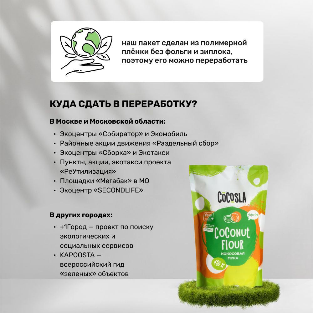 Мы производим кокосовую муку на Шри-Ланке на заводе, сертифицированном EU USDA. Шри-Ланка - страна экологического земледелия, где для выращивания биопродуктов отказались от применения синтетических пестицидов и удобрений. Кокосовая мука Cocosla - 100% чистый по составу натуральный продукт. Кокосовая мука не содержит следов пестицидов, химикатов, синтетических ароматизаторов, красителей, следов антибиотиков или гормонов, без ГМО. Мука органик Cocosla не обрабатывается диоксидом серы.