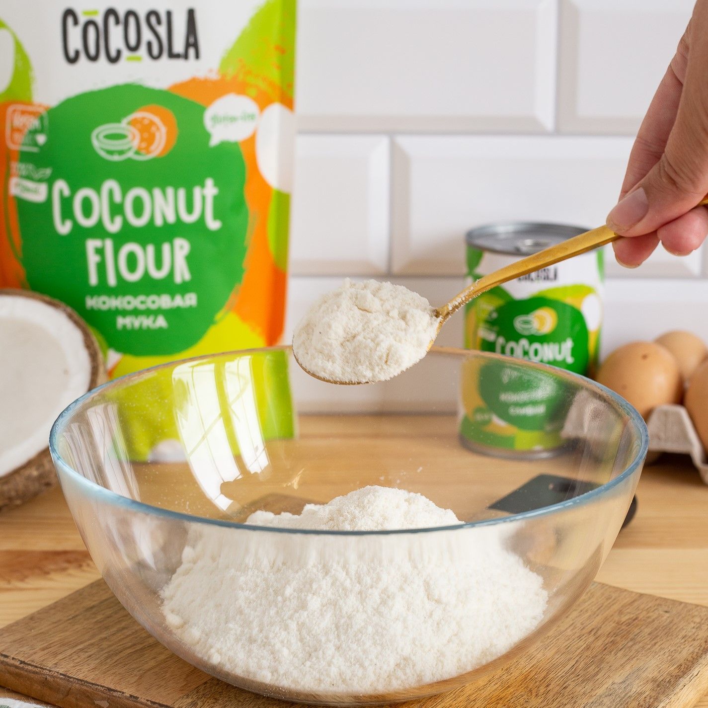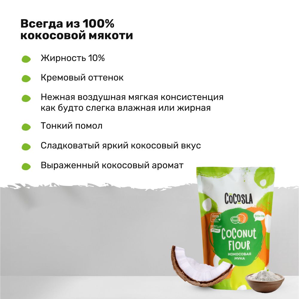 Описание: Кокосовая мука тонкого помола Cocosla из высушенной и измельченной кокосовой мякоти. Тонкий помол делает муку из кокоса очень нежной, мягкой и воздушной. Кокосовая мука Cocosla кремового цвета, потому что не отбеленная.  Кокосовая мякоть для нашей муки не обрабатывается диоксидом серы или любым другим консервантом, чтобы зафиксировать цвет или отбелить её, поэтому она кремовая.  Мякоть кокоса без диоксида серы под воздействием кислорода слегка темнеет. Кокосовая мука Cocosla, для производства которой идет именно кокосовая мякоть, а не жмых - мягкая, сладковатая, насыщенная и очень ароматная.
