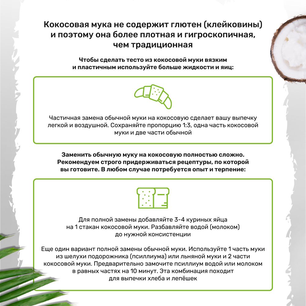 Мука из мякоти кокоса, наряду с такими продуктами как: миндальная мука или рисовая мука, достаточно новый продукт на нашем столе. Мука без глютена или, другими словами, без клейковины достаточно сложна в обращении. Но это не значит, что от такого ценного источника белка и клетчатки нужно отказываться. На стадии знакомства с этой кето-мукой для достижения желаемого результата лучше всего использовать уже проверенные рецепты. Без глютена мука не поднимается так же, как пшеничная мука, а из-за высокого содержания клетчатки впитывает гораздо больше жидкости, чем всё та же пшеничная. Тесто из безглютеновой кокосовой муки может получиться более сухим и рассыпчатым, менее клейким и неэластичным. Чтобы вернуть тесту вязкость и пластичность просто добавьте больше жидкости или яиц.