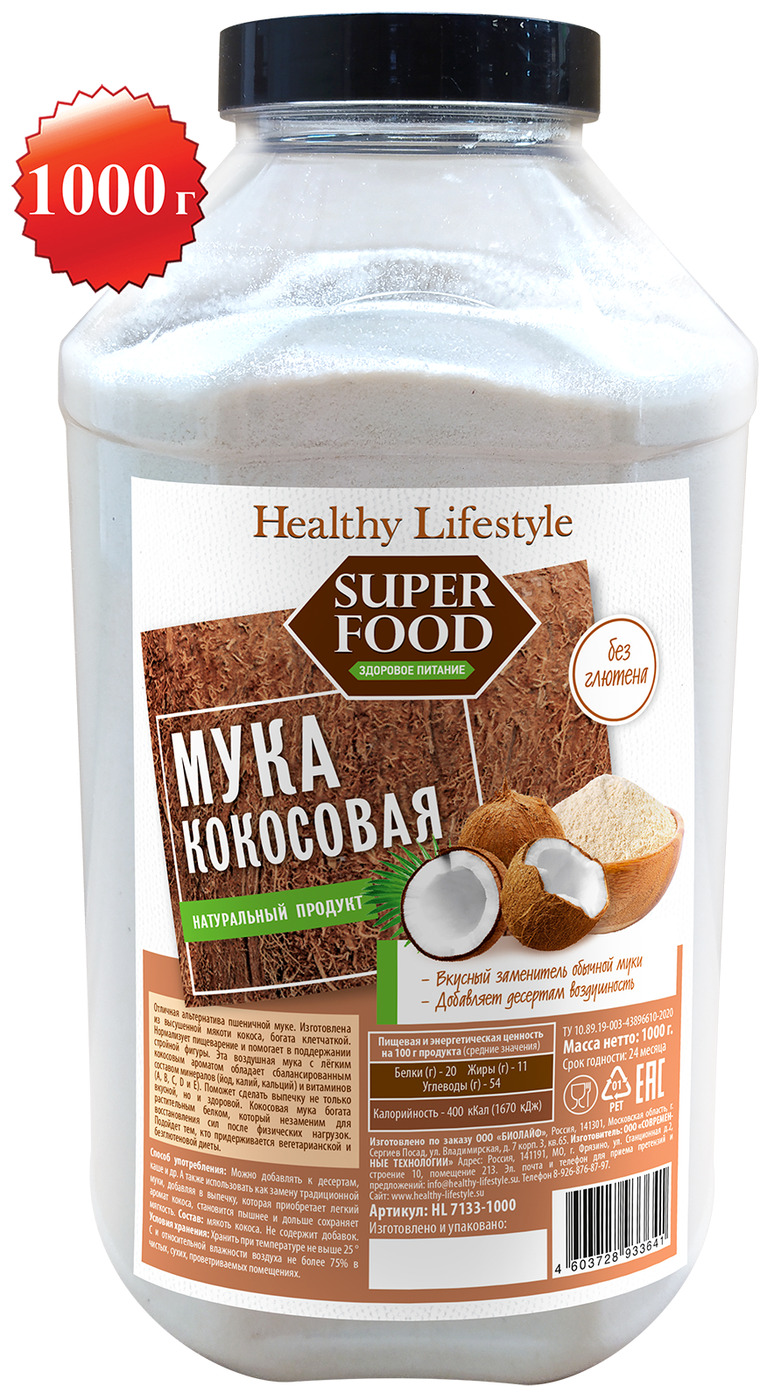 Кокосовая мука без глютена низкоуглеводная в банке Healthy Lifestyle без сахара и глютена, подходит для кетодиеты и выпечки, растительная клетчатка, мякоть кокоса, продукты для похудения 1 кг (1000 г)