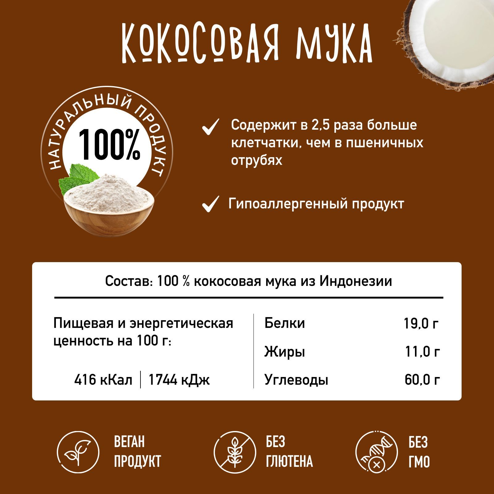 Описание: Кокосовая мукаКокосовая мука - полноценный источник разнообразных питательных веществ, что способствует здоровому пищеварению и отличному усвоению витаминов и минералов.