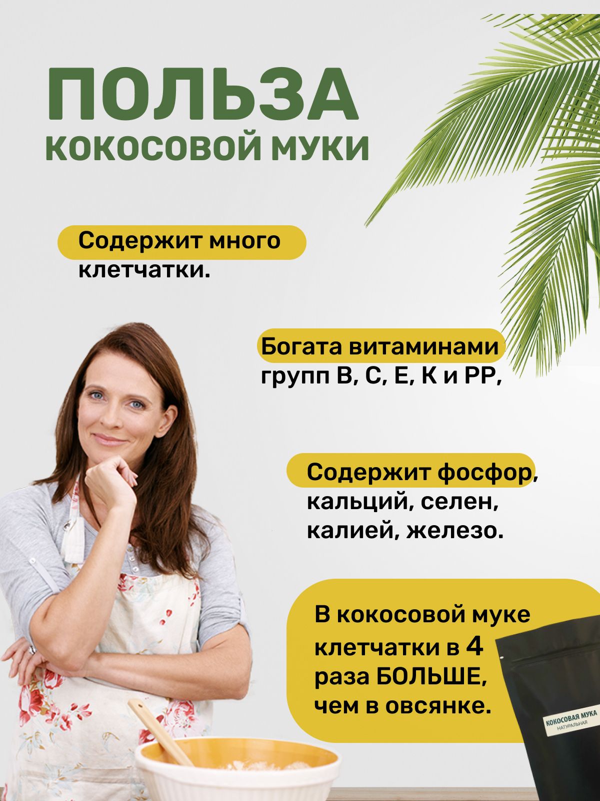 Описание: Кокосовая мука-натуральный, низкокалорийный продукт! Подойдет для веганов и для тех, кто на диете. Изготовлена из высушенной мякоти кокоса, богата клетчаткой, содержит значительное количество белка. Нормализует пищеварение и помогает в поддержании стройной фигуры. Эта воздушная мука с лёгким кокосовым ароматом обладает сбалансированным составом минералов (йод, калий, кальций) и витаминов (А, В, С, D и E). Йод, содержащийся в кокосовой муке, улучшает работу щитовидной железы, а кальций -укрепляет кости, зубы. Мука кокоса поможет сделать выпечку не только вкусной, но и здоровой. Она придает легкий кокосовый аромат и вкус любой выпечке, блинчикам, оладьям. Из кокосовой муки получаются прекрасные пп печенье и кексы. Без ГМО, без сахара, без молочного белка, без глютена и лактозы, без консервантов и прочих добавок. Её добавляют в йогурты, коктейли, смузи, каши, супы-пюре и запеканки. Попробуйте использовать вместо пшеничной муки, вам обязательно понравится!