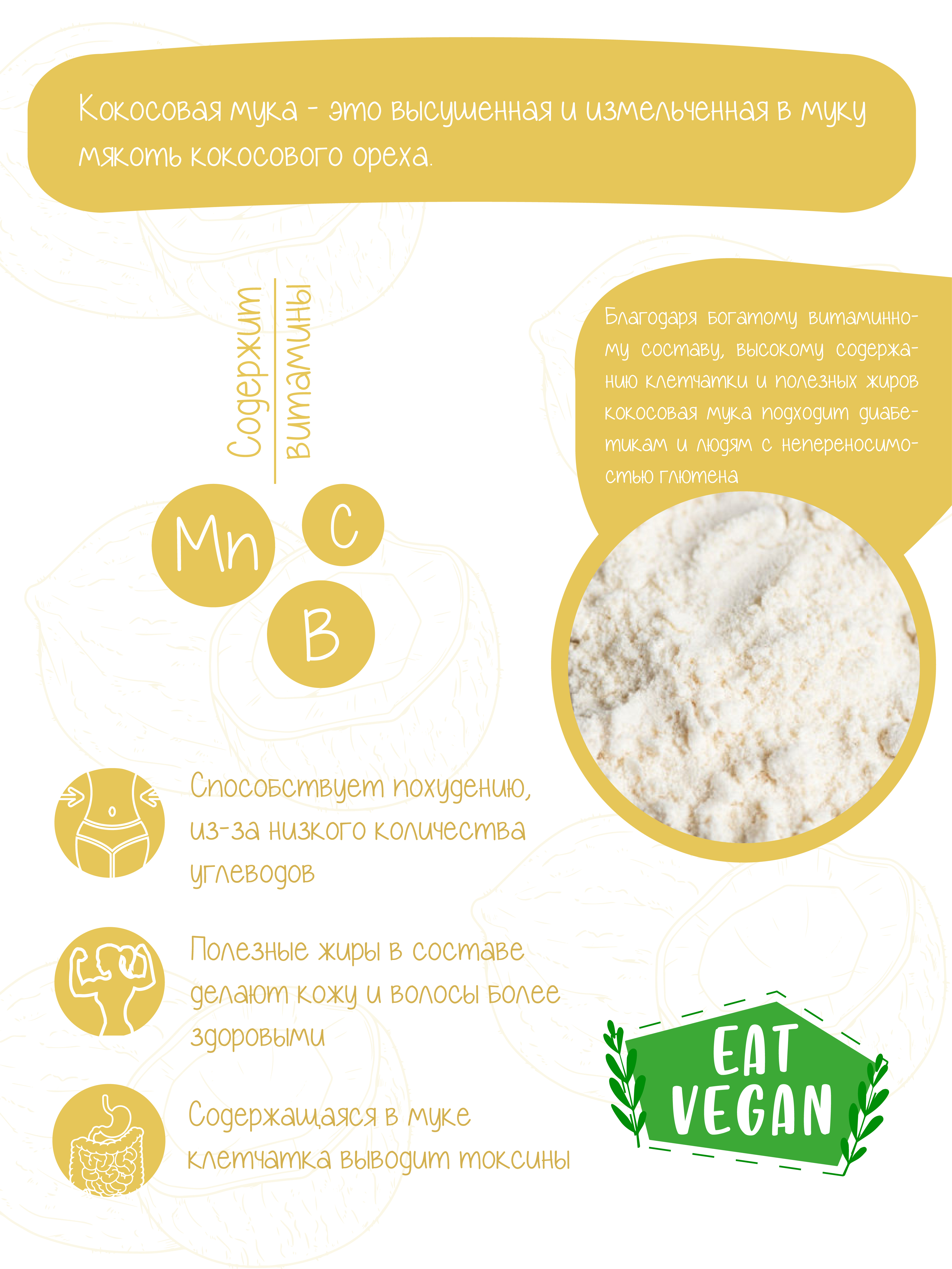 Описание: Кокосовая мука это уникальный продукт. Одна из главных ее особенностей в низком гликемическом индексе, это значит, что ее употребление не повышает уровень сахара в крови. Кокосовая мука богата витаминами B1 B9, C, E, кальцием, калием, железом, фосфором, натрием и некоторыми незаменимыми жирными кислотами. А высокое содержание в ней клетчатки оказывает положительное влияние на пищеварительные процессы. А использовать ее можно как замену обычной муке и готовить из нее любимые блюда.