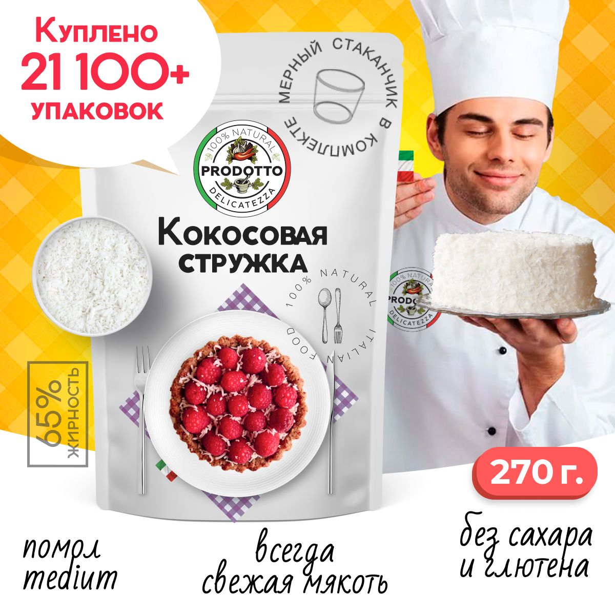 Кокосовая стружка 270 грамм, натуральная кондитерская посыпка без сахара для приготовления сладких блюд начинок коктейлей кремов, выпечки рулетов и украшения тортов