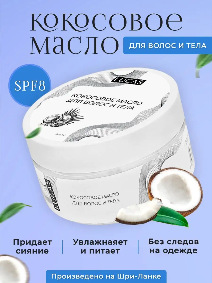 Кокосовое масло для волос тела и загара SPF 8