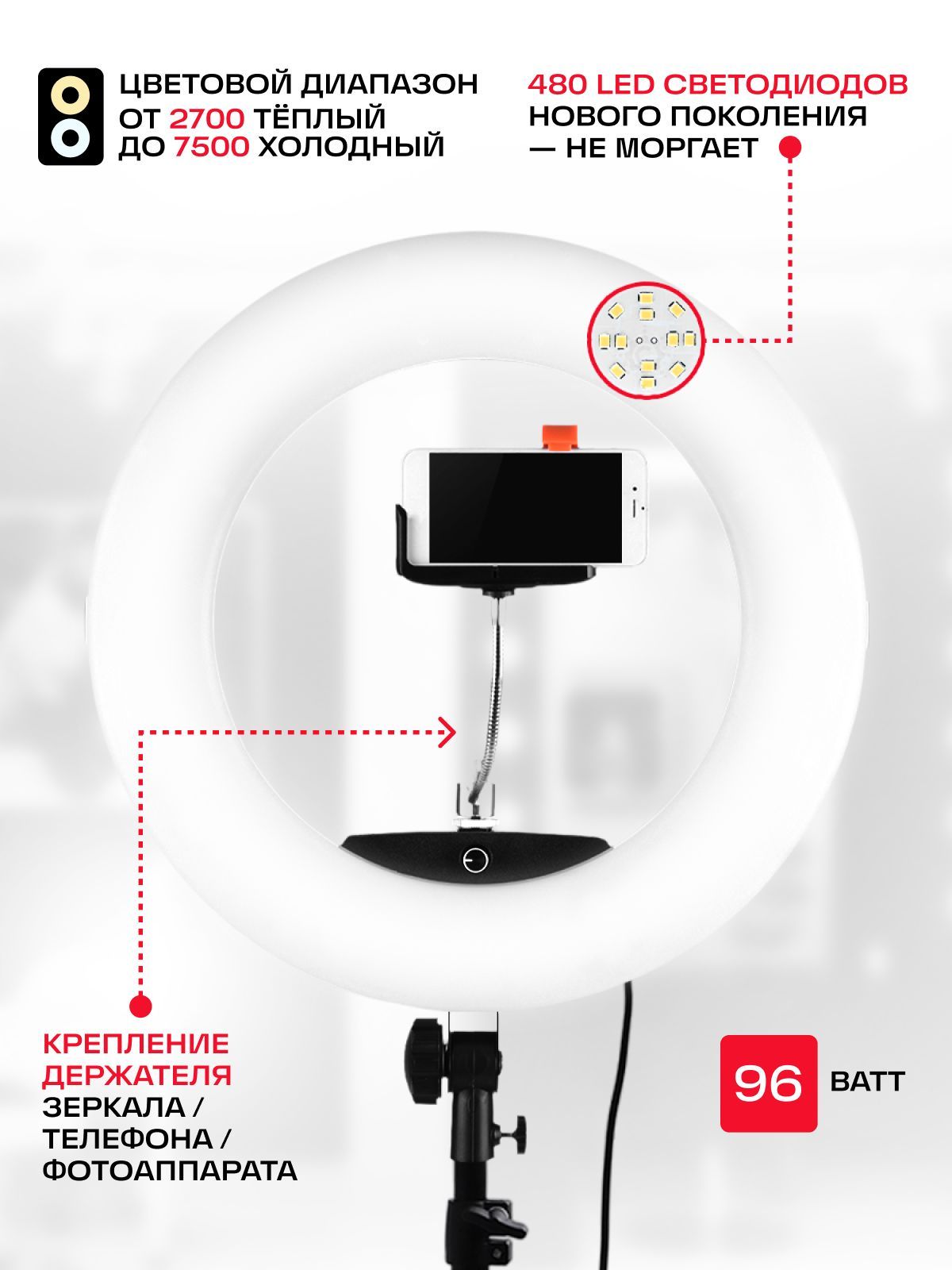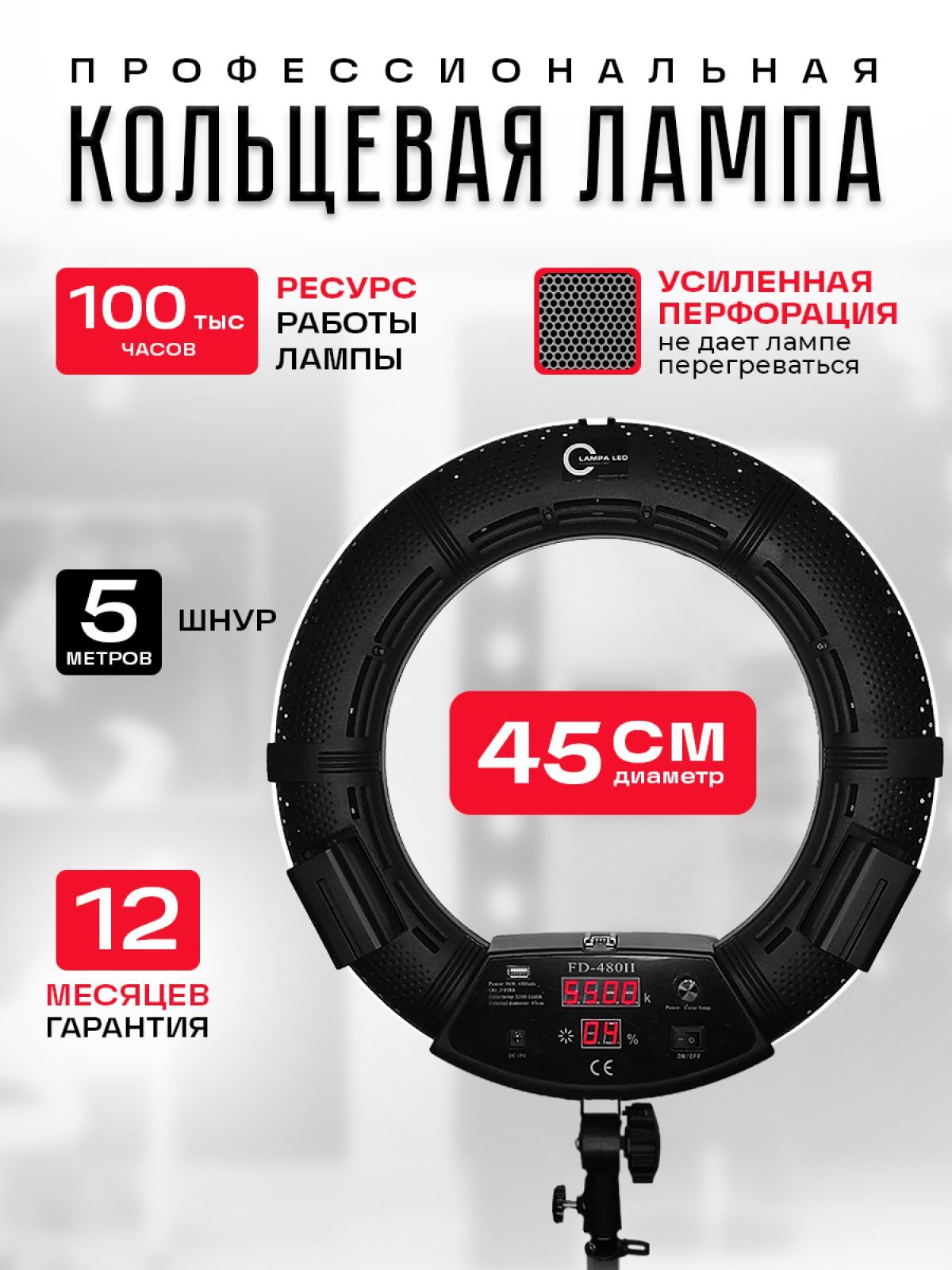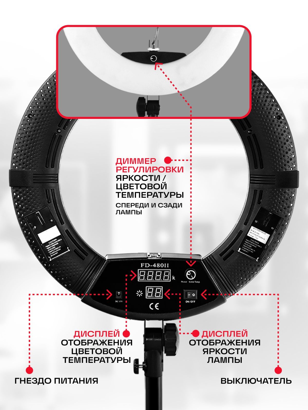 Кольцевая лампа FD 480 ll – популярное освещение из коллекции кольцевых ламп естественного света. Явным преимуществом этого продукта является увеличение количества лампочек, что составляет 480 штук. Таким образом, каждый потребитель должен сразу понять, что данная лампа позволит осветить больше пространства, и, таким образом, свет будет более насыщенным. На задней панельке установлены два цифровых экрана, которые покажут теплоту и яркость света.Преимуществом данной модели - является отсутствие бликов и тот факт, что свет рассеивается равномерно. Каждый специалист, в первую очередь, в этой кольцевой лампе, отмечает наличие переменной цветовой температуры и индекса цветопередачи, что в свою очередь делает ее более привлекательной для многих высококвалифицированных специалистов в различных областях, где требуется высококачественный свет.