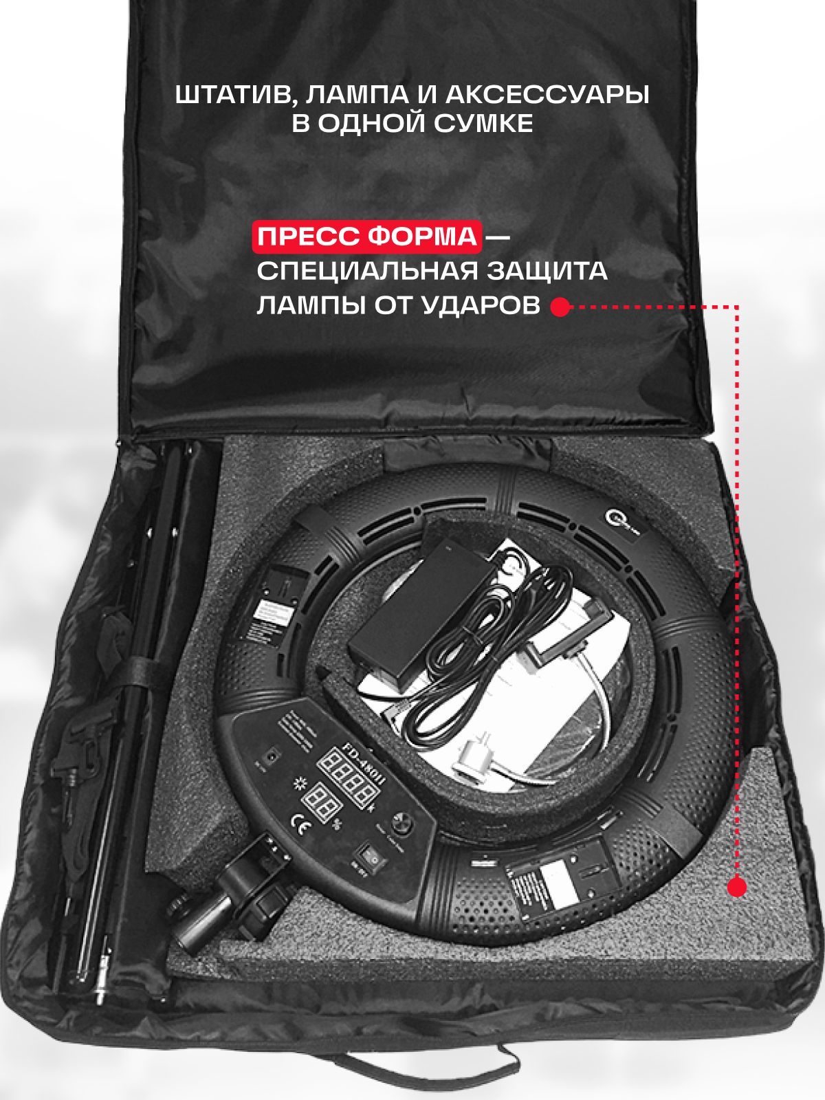Кольцевая светодиодная лампа. Адаптер питания. Шнур питания. Гибкий держатель для камеры и телефона. Зеркало гримерное. Штатив (48,5-185 см). Сумка.