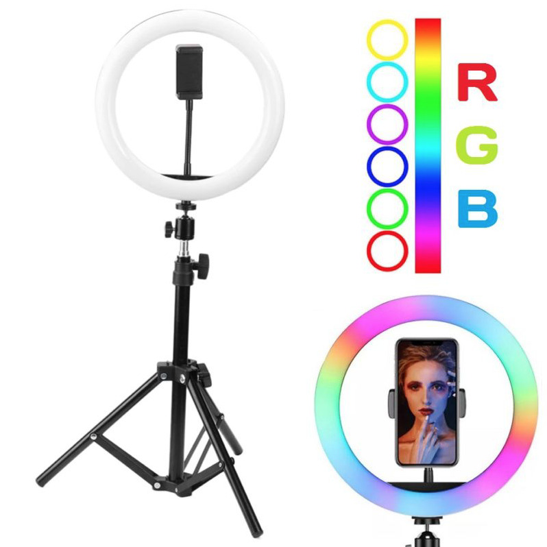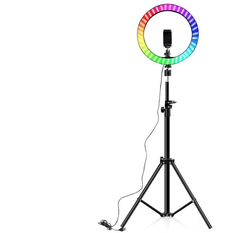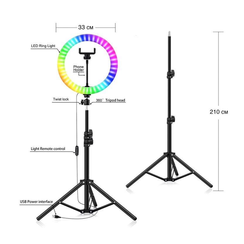Кольцевая LED светодиодная лампа цветная (мультиколор) RGB MJ33 33 см с держателем для смартфона на металлическом штативе 210 см. Для селфи, визажиста, блоггера и косметолога.