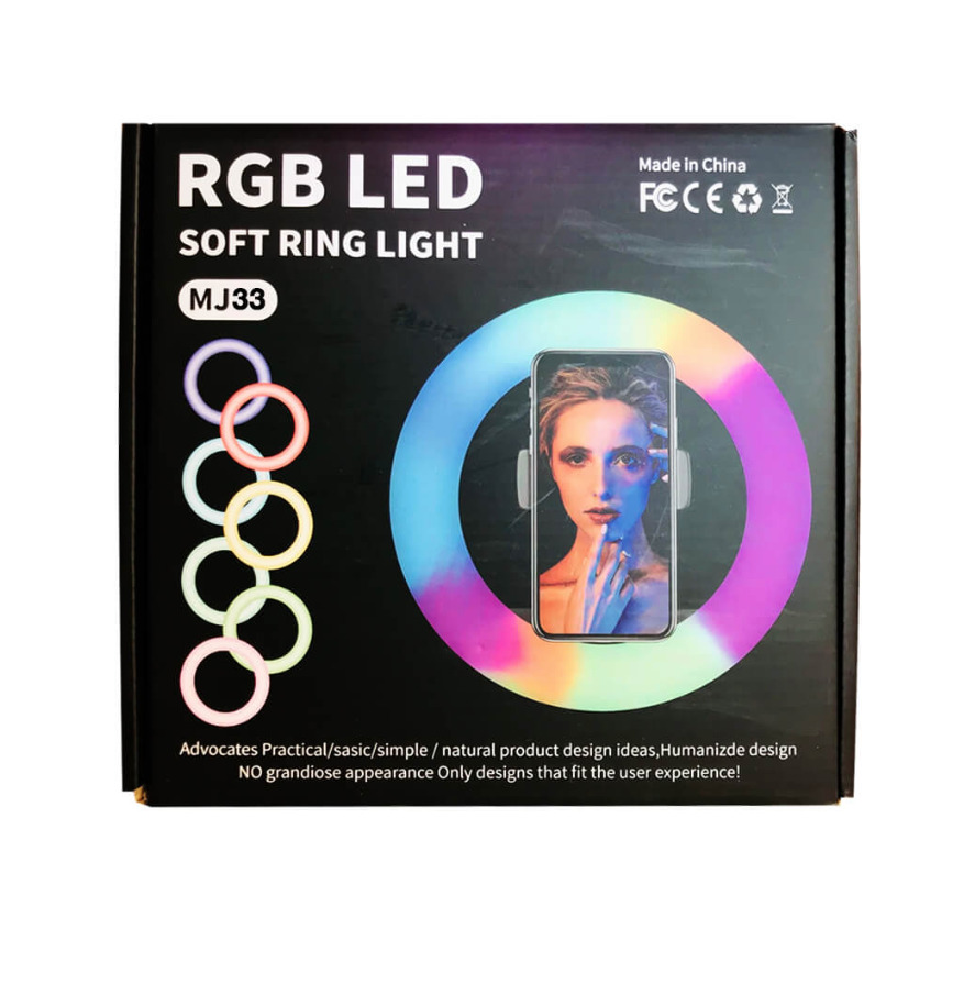 Управлять светом, регулируя интенсивность свечения и выбирая цвета, можно с помощью пульта, расположенного на проводе питания. Кольцевая лампа RGB LED MJ 33 работает от любого порта USB, легкая и в то же время прочная.