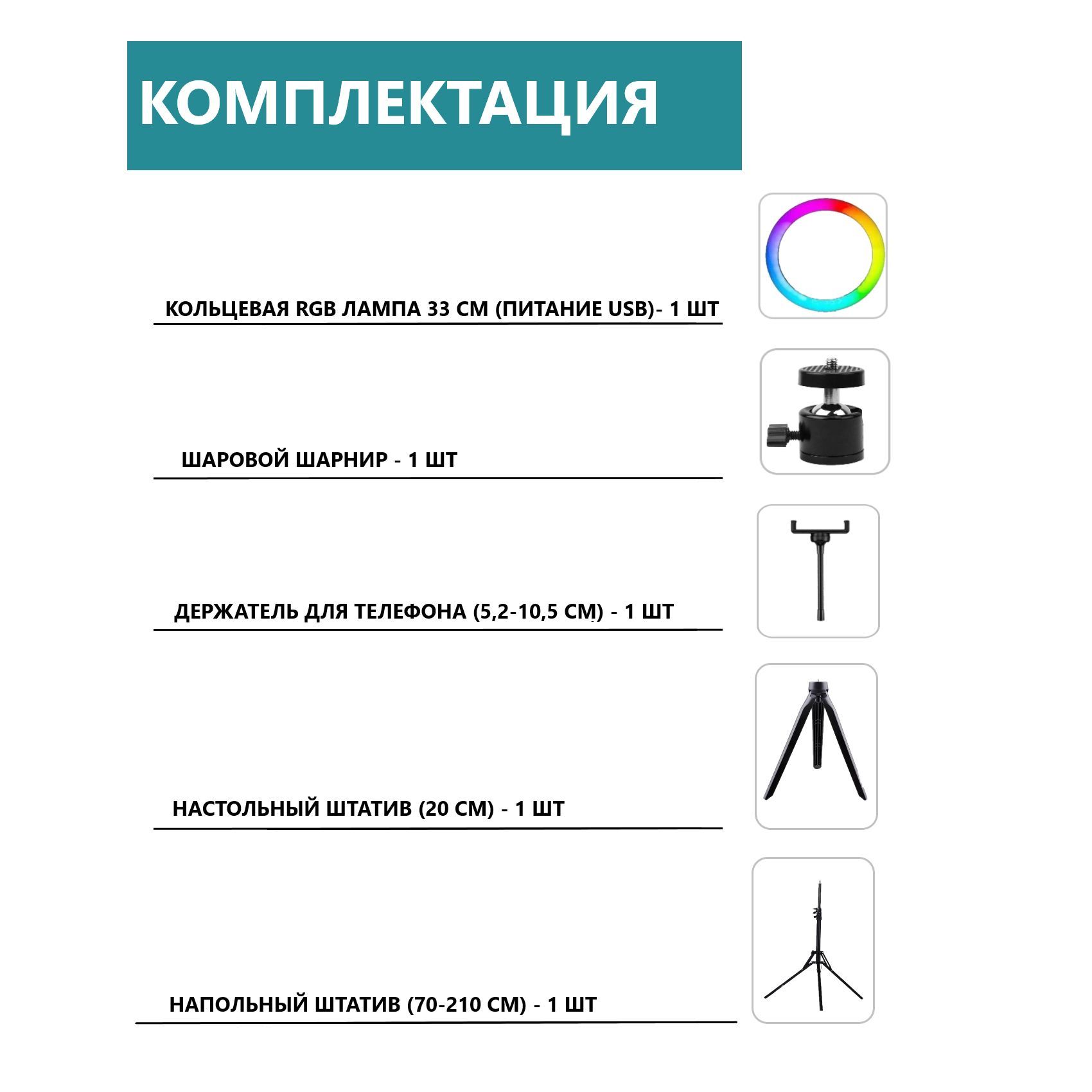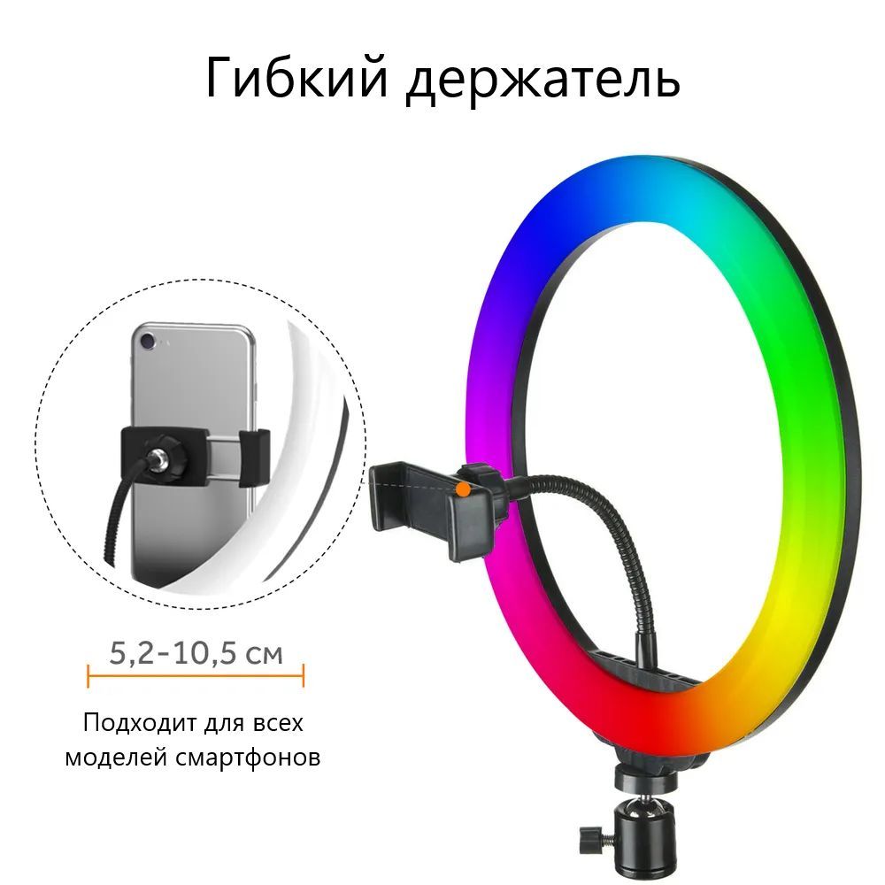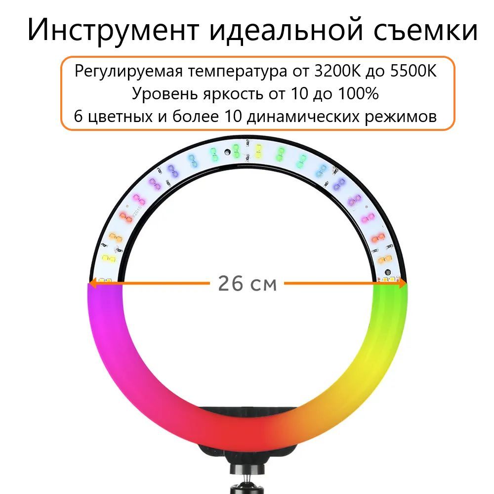 Цветная RGB кольцевая лампа 26 см, держатель для смартфона, металлический шарнир, штатив от 70 до 210 см, Bluetooth пульт для смартфона, штатив настольный.