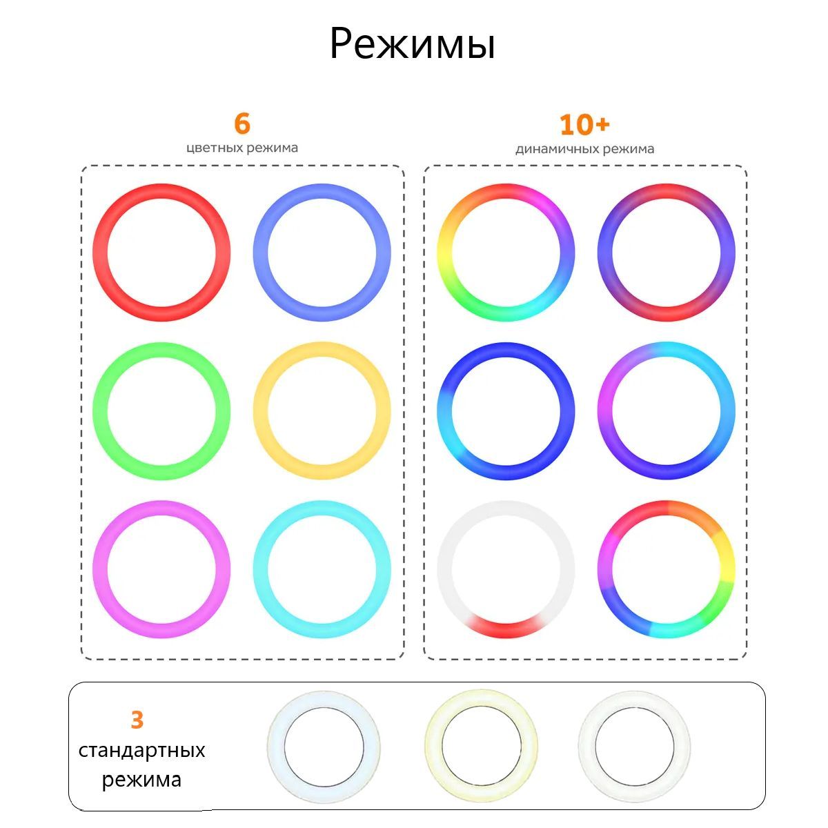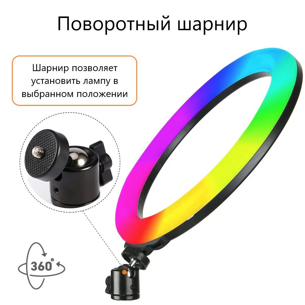 Кольцевая лэд лампа оснащена вращаемым шарниром, который обеспечивает возможность настройки угла светильника так, как вам необходимо. Можно выставить свет абсолютно с любого угла, и закрепить телефон на гибком креплении, которое будет адаптироваться под положение штатива. 3 температурных режима позволяют выставить цвет в диапазоне от 3200K до 5500К.